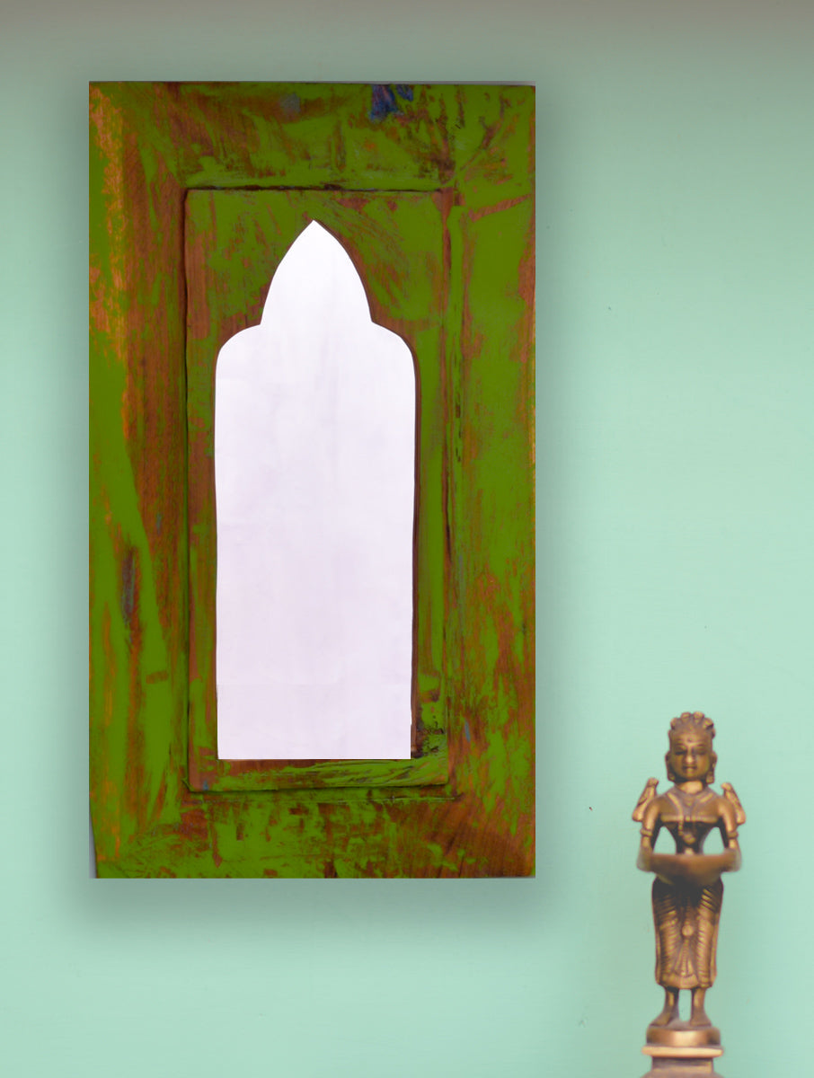 HANDPAINTED GREEN ANTIQUE MIRROR WITH VINTAGE WOODEN FRAME