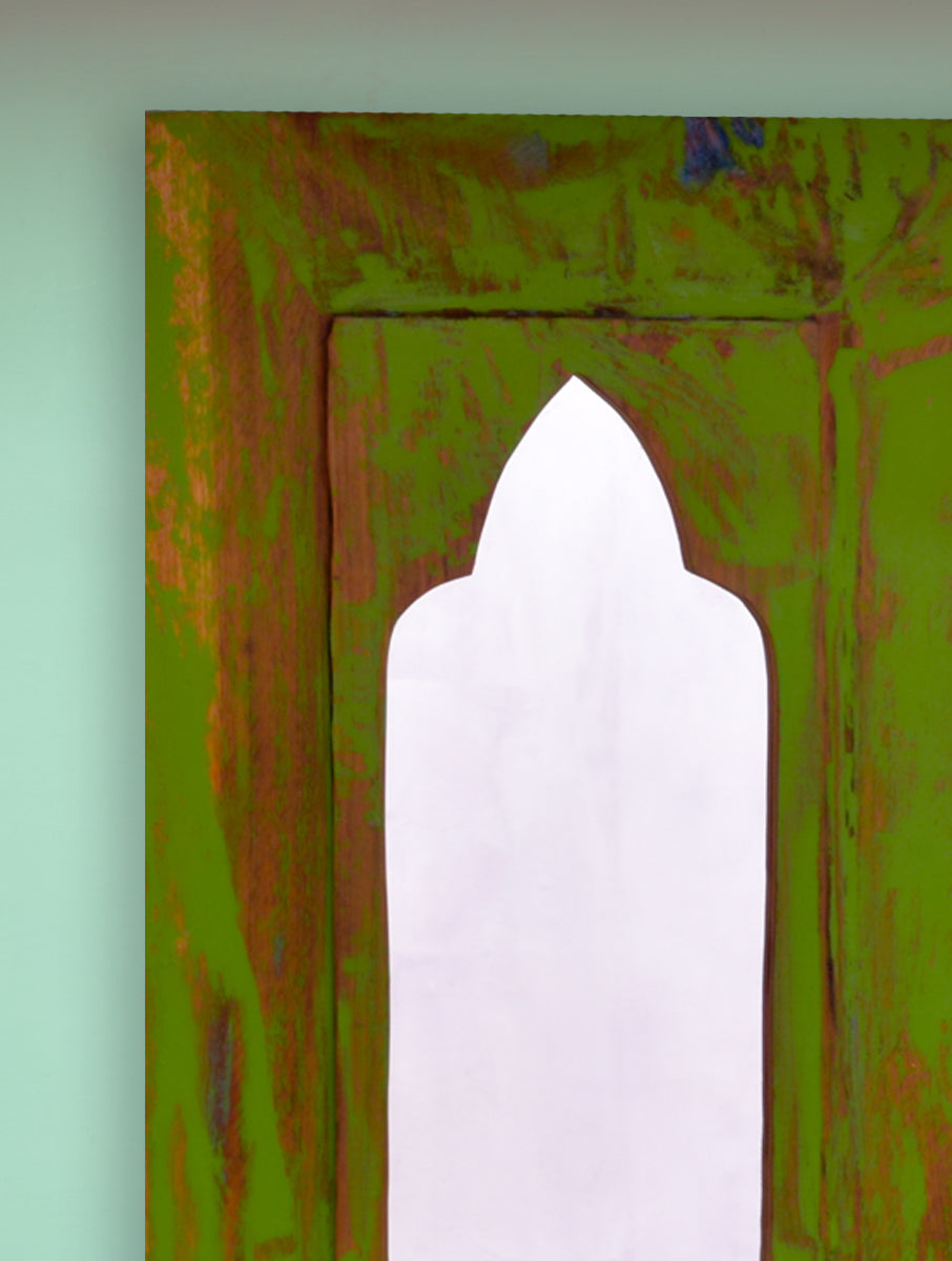 Pratibimb by Ba No Batwo is a handcrafted collection of vintage mirrors, handcarved in repurposed teak wood and handpainted in distress style. The intricate carvings on each of these pieces have been inspired by the elaborate arches of Mughal-era architecture.