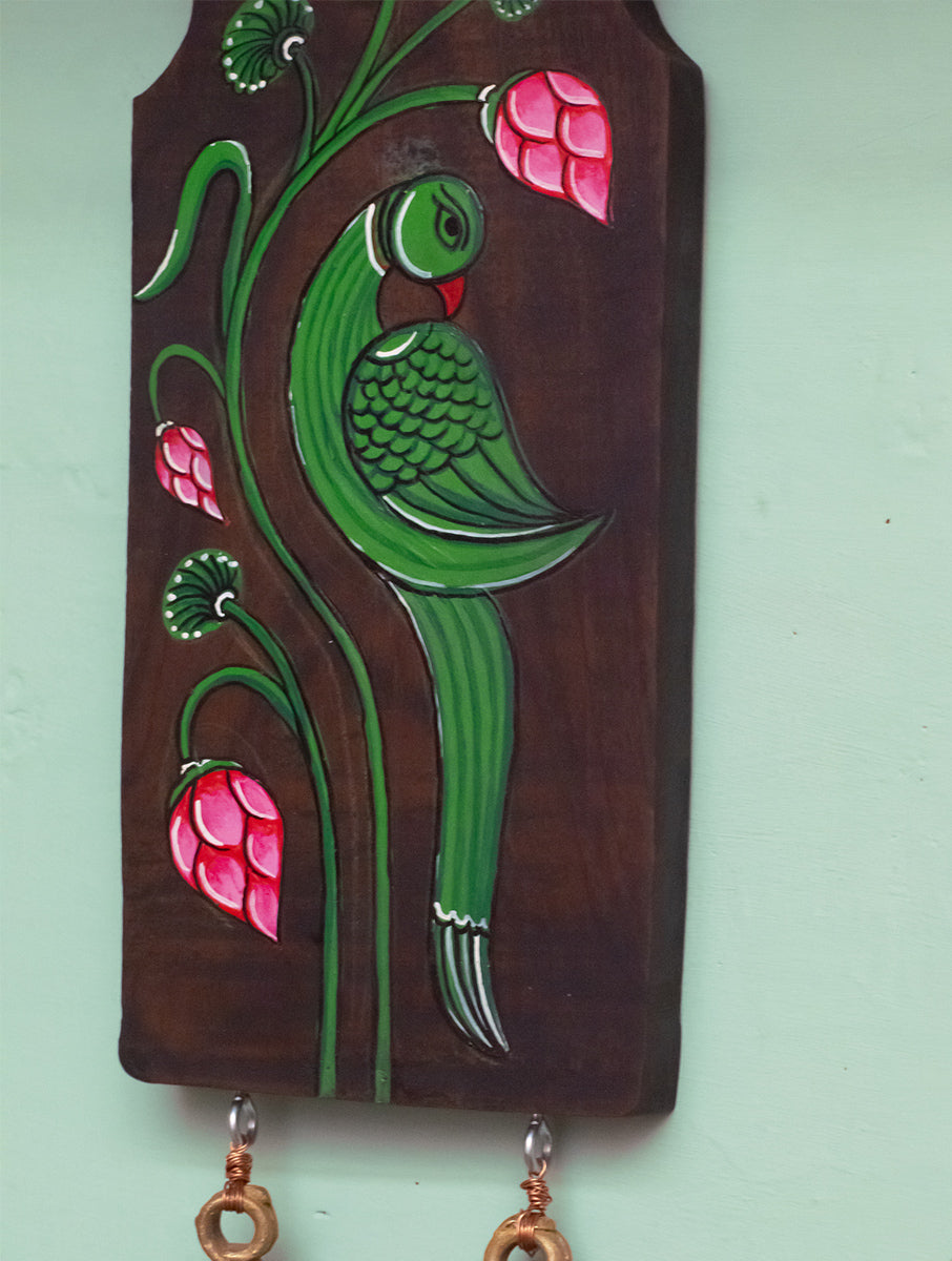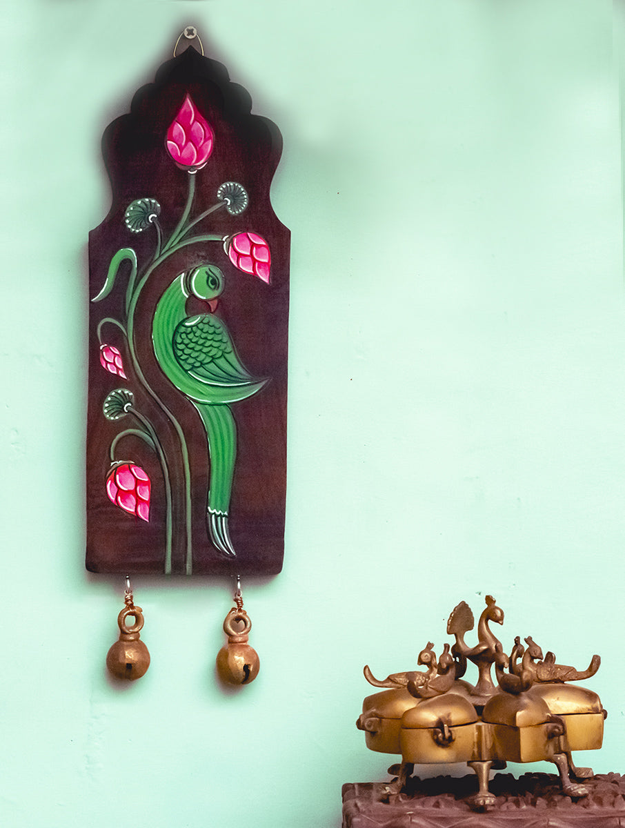 HANDPAINTED RED GREEN PARROT PATTACHITRA ANTIQUE VINTAGE WOODEN WALLART WITH BRASS ORNAMENT