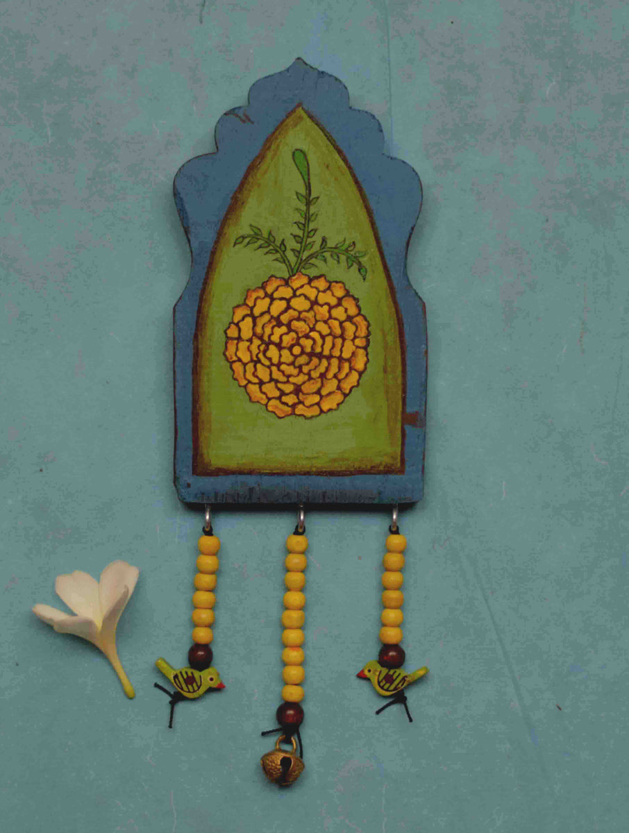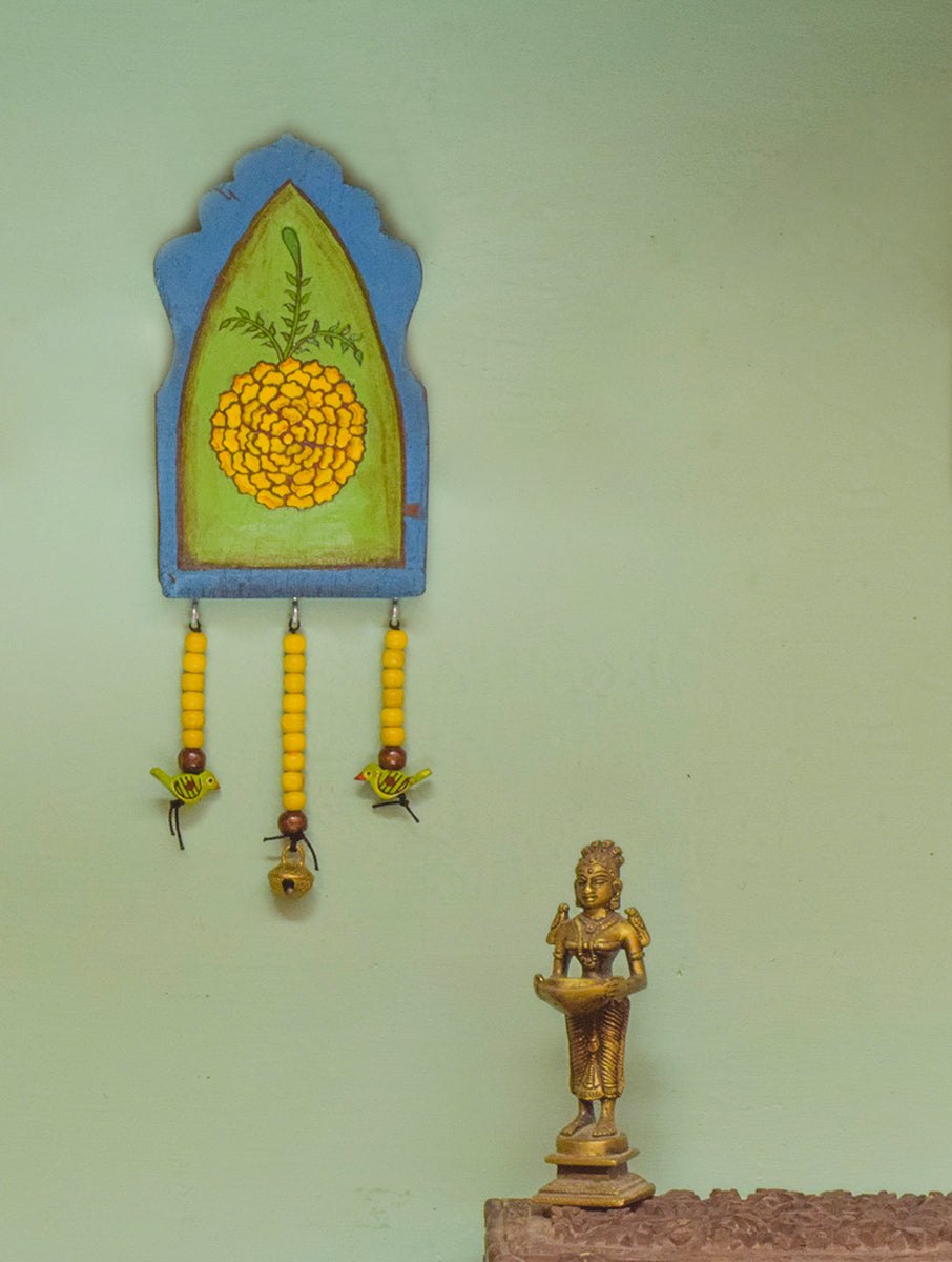 HANDPAINTED BLUE GREEN YELLOW ANTIQUE VINTAGE WOODEN WALLART WITH WOODEN BEADS AND BRASS ORNAMENT
