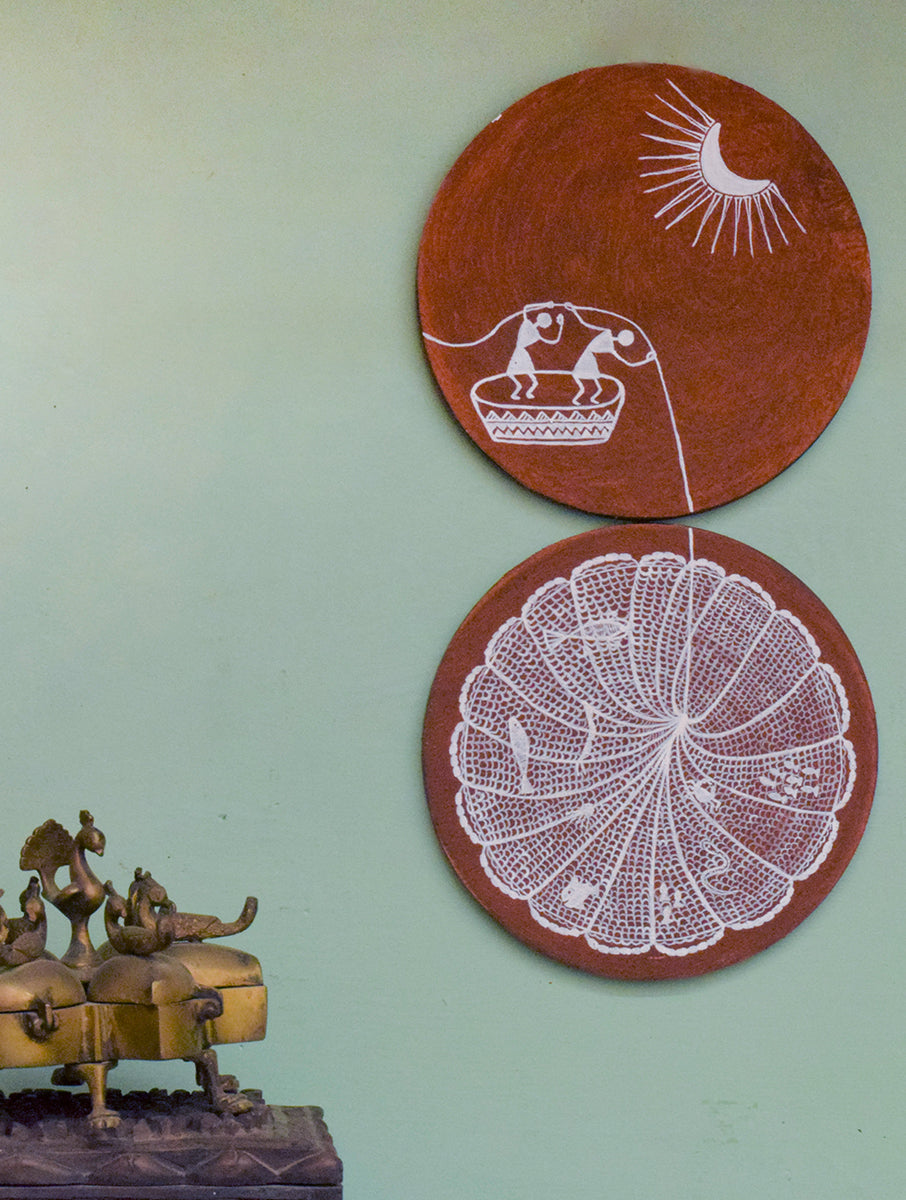 "Bhumi" by Ba No Batwo is a handcrafted collection of warli wallart handpainted and handcrafted with canvas on metal plates.