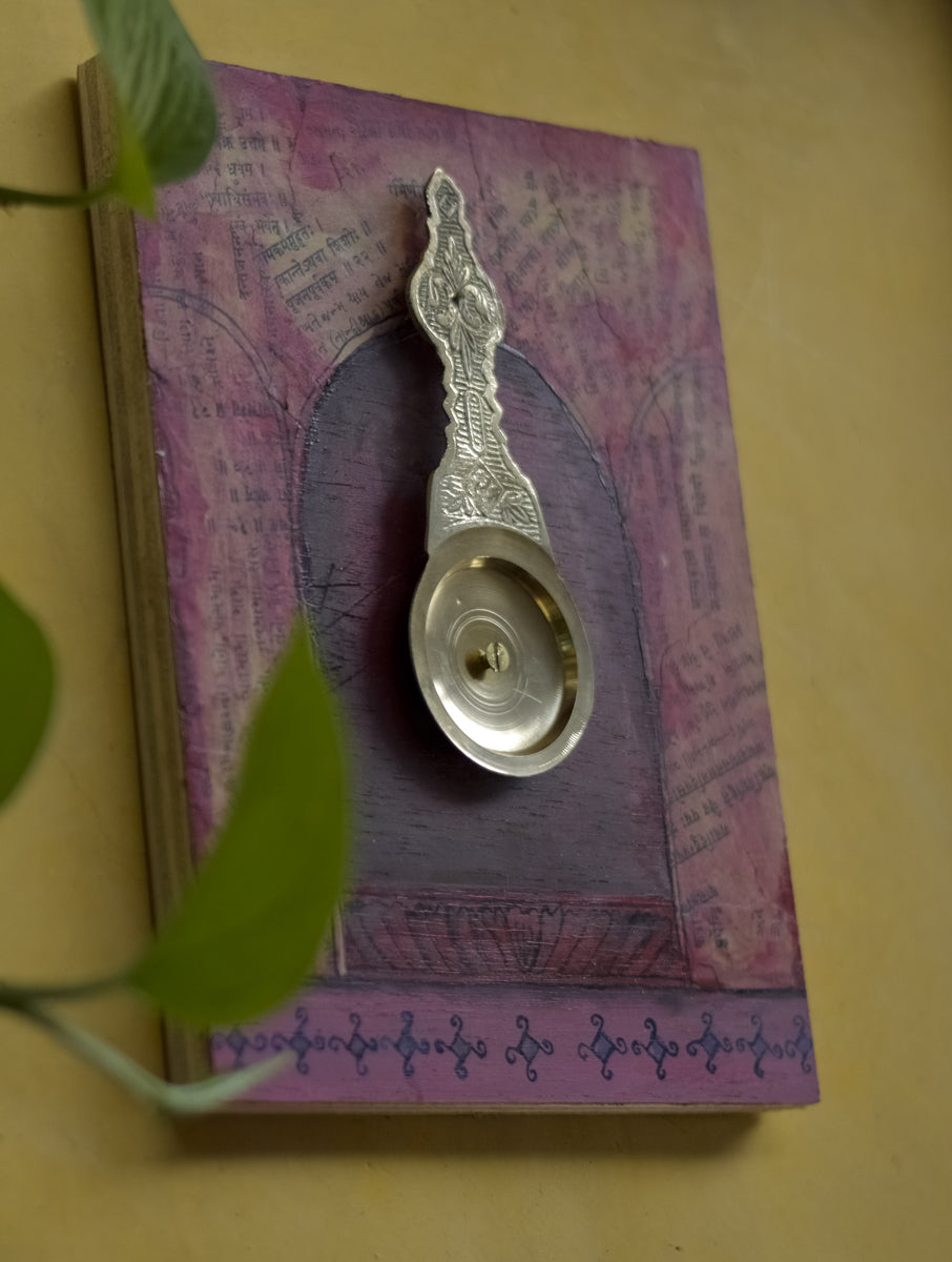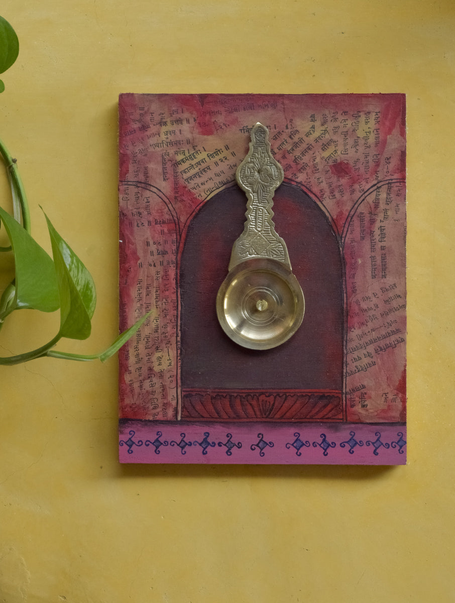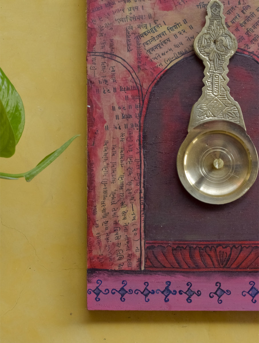 kāṃsya by Ba No Batwo is a handcrafted collection of vintage wallart, handcarved in repurposed MDF, vintage book pages, handpainted in miniature, pattachitra and distressed style. The vintage style copper ornament adds uniqueness to each piece.