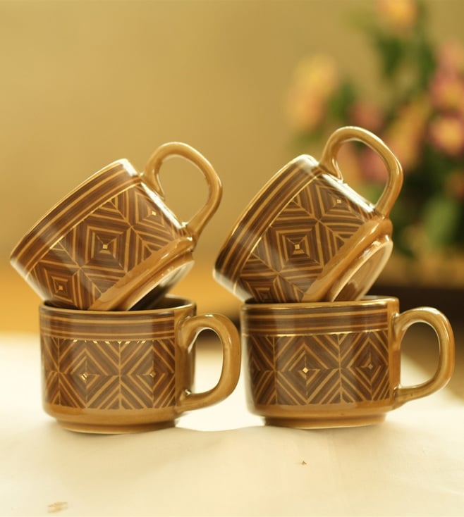 Show off your signature style at your next gathering with the Courtyard Yellow or green Barmer Cups. Featuring four ceramic cups inspired by the classic Barmer style from India, this set will add a chic, timeless feel to any home. The bright, sunny yellow colour brings natural warmth and vigour to the room, while the smooth, glossy finish provides a unique look in your kitchen. Disclaimer: All other items in the image are only for display purposes and will not be a part of the delivery content. Product colour may slightly vary due to photographic lighting sources. Country of Origin - India.