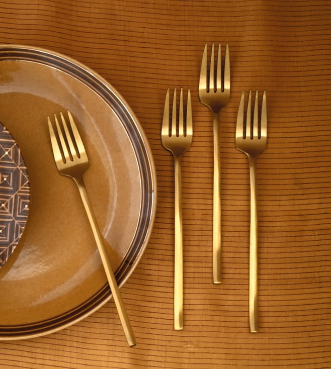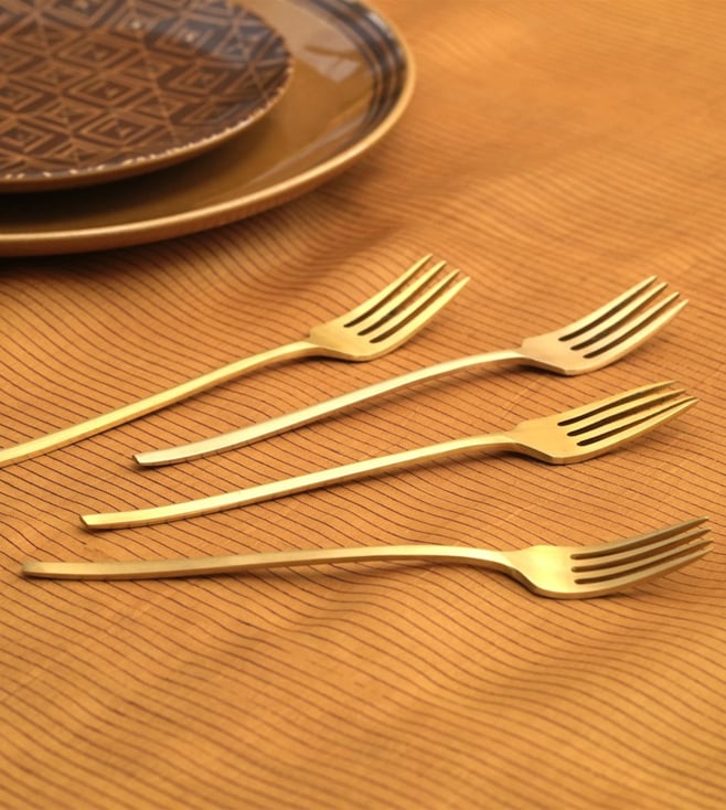 Make an elegant addition to your home with the Courtyard Gold Myrda Table Fork (Set of 4). A luxurious style crafted from brass, the fork has a beautiful gold finish to instantly add a touch of glamour to your tabletop. Ideal for any home decor style, the forks have a lightweight design for easy handling. Disclaimer: All other items in the image are only for display purposes and will not be a part of the delivery content. Product colour may slightly vary due to photographic lighting sources. Country of Origin - India.