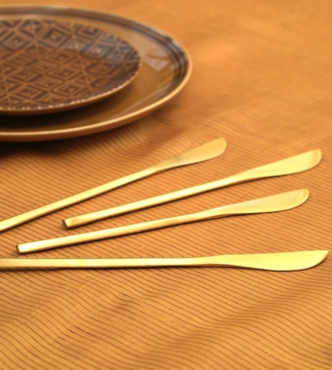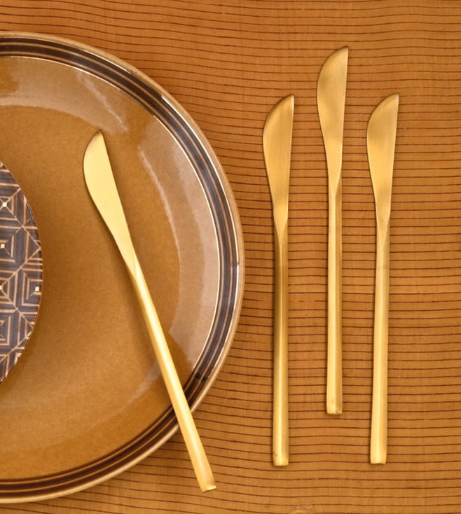 Enhance the look of your dining table with the elegant and stylish Courtyard Gold Myrda Table Knife (Set of 4). These knives are crafted from high-quality brass, giving them a beautiful gold finish that catches the eye. The durable construction and sharp blades make it an ideal choice for cutting through even the toughest foods. Disclaimer: All other items in the image are only for display purposes and will not be a part of the delivery content. Product colour may slightly vary due to photographic lighting sources. Country of Origin - India.