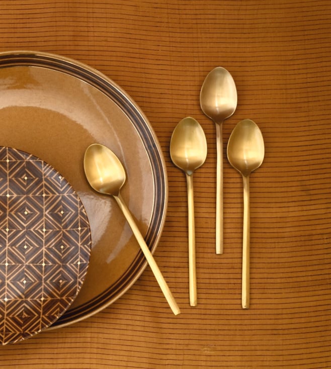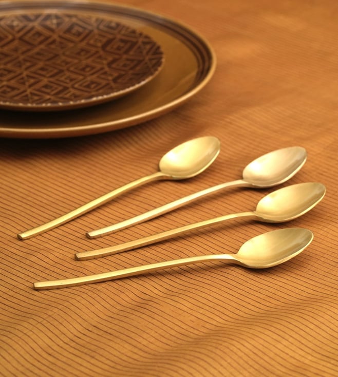 The Courtyard Gold Myrda Tea Spoon set of 4 is crafted with luxurious brass for a rich and sophisticated look. The elegant gold finish adds a luxurious touch to your tea-time. Each spoon is perfectly balanced for ease of handling. An ideal purchase for your stylish home, this spoon set is the perfect finishing touch to your afternoon tea ritual. Disclaimer: All other items in the image are only for display purposes and will not be a part of the delivery content. Product colour may slightly vary due to photographic lighting sources. Country of Origin - India.