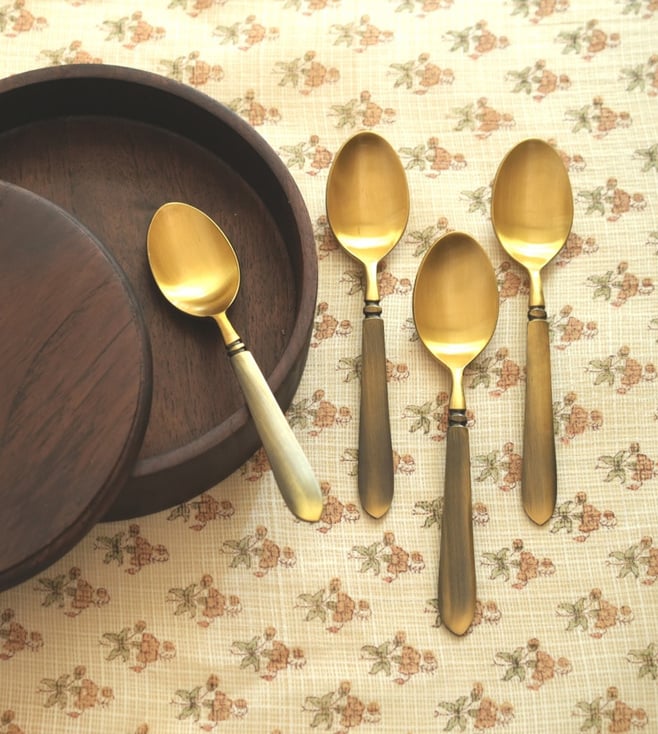 Get the perfect set of spoons for your home with the Courtyard Multi Reti Tea Spoon Set of 4! This set of 4 spoons is constructed from brass, making them a durable and trendy addition to any kitchen. The multi-coloured spoons will bring a beautiful and vibrant touch to your kitchen d¿cor. The tea spoons are elegantly designed and perfect for stirring and serving tea. Disclaimer: All other items in the image are only for display purposes and will not be a part of the delivery content. Product colour may slightly vary due to photographic lighting sources. Country of Origin - India.