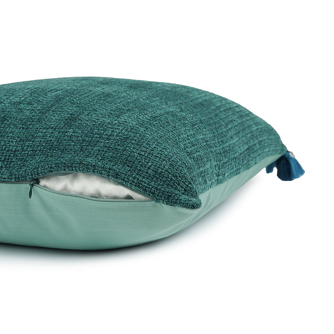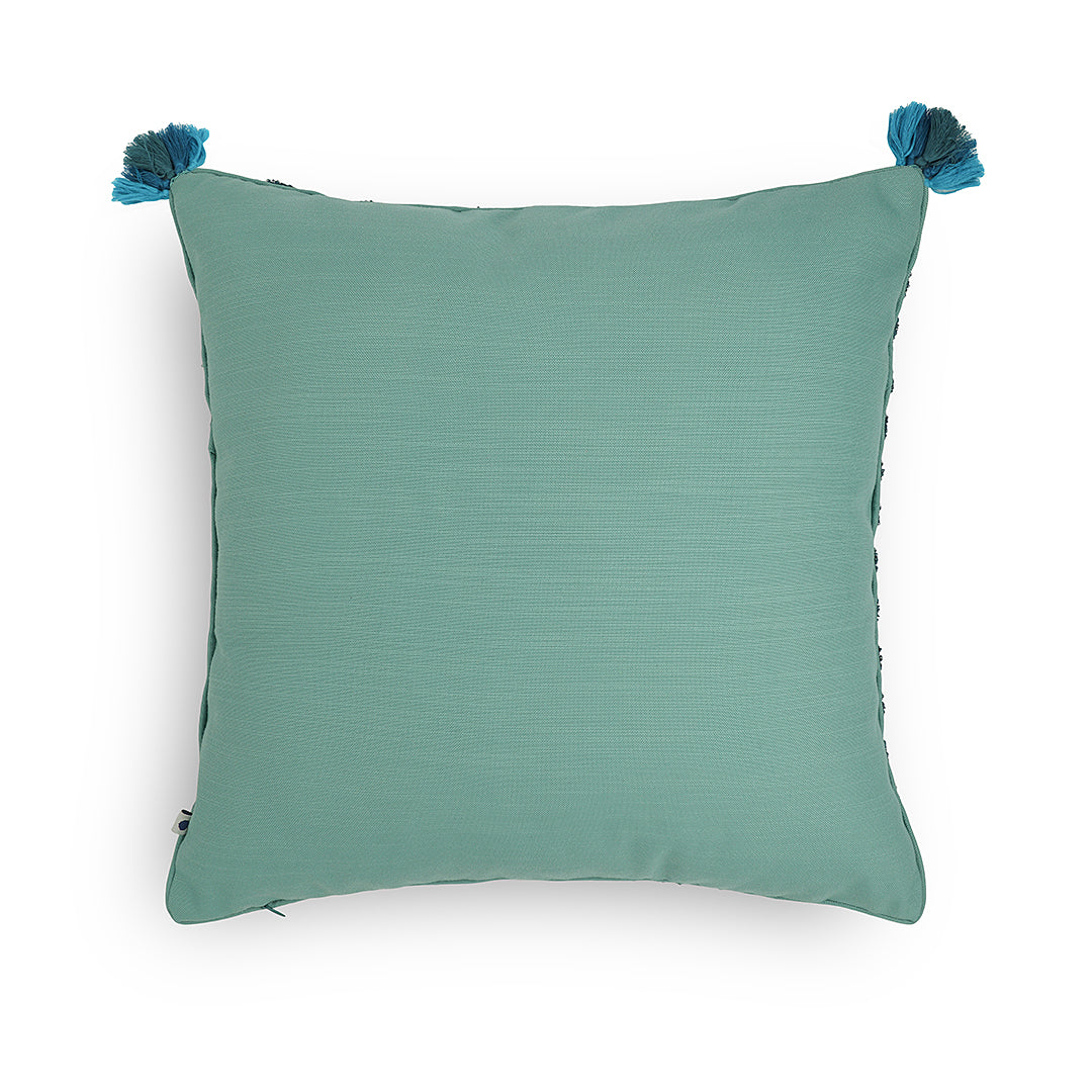Artisanal charm meets tactile delight in this meticulously crafted cushion. Handwoven fabrics provide a delightful texture, while a tonal palette creates visual harmony. Playful pompoms add a whimsical touch, fusing craftsmanship with style. The blue color complements the palette beautifully or offers a striking contrast for perfect harmony.