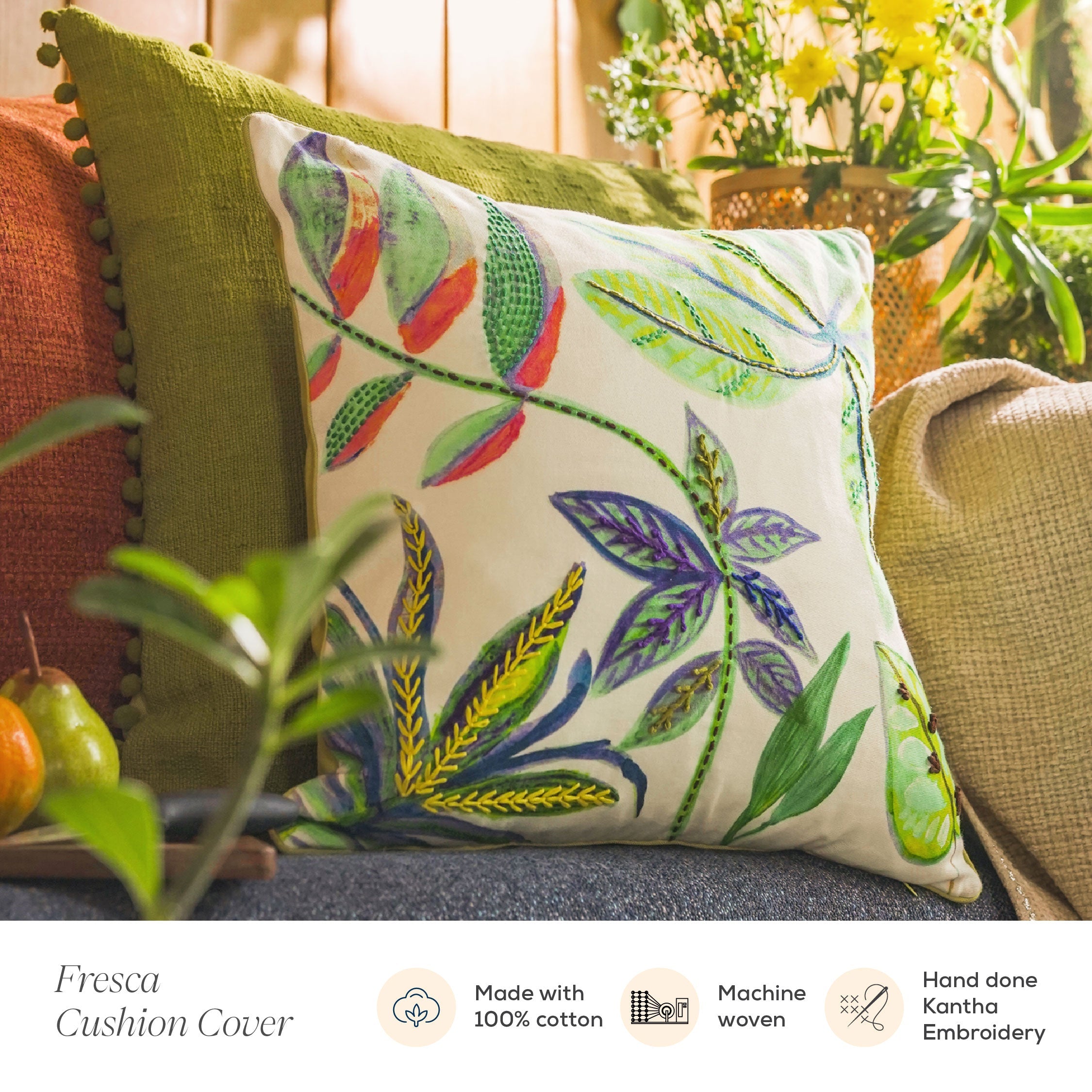 Embrace the tranquil whispers of nature with our Fresca cushion cover. Inspired by the lush beauty of summer foliage, this design captures the essence of a verdant garden in full bloom. Each leafy detail is meticulously hand-embroidered with Kantha stitch, infusing the fabric with intricate brushstrokes and a sense of artisanal craftsmanship. As you cozy up with this cushion, you'll feel the gentle embrace of nature's serenity enveloping your space, creating an ambiance of peace and harmony. Let the symphony of the forest echo through your home, bringing a touch of organic elegance to your decor.