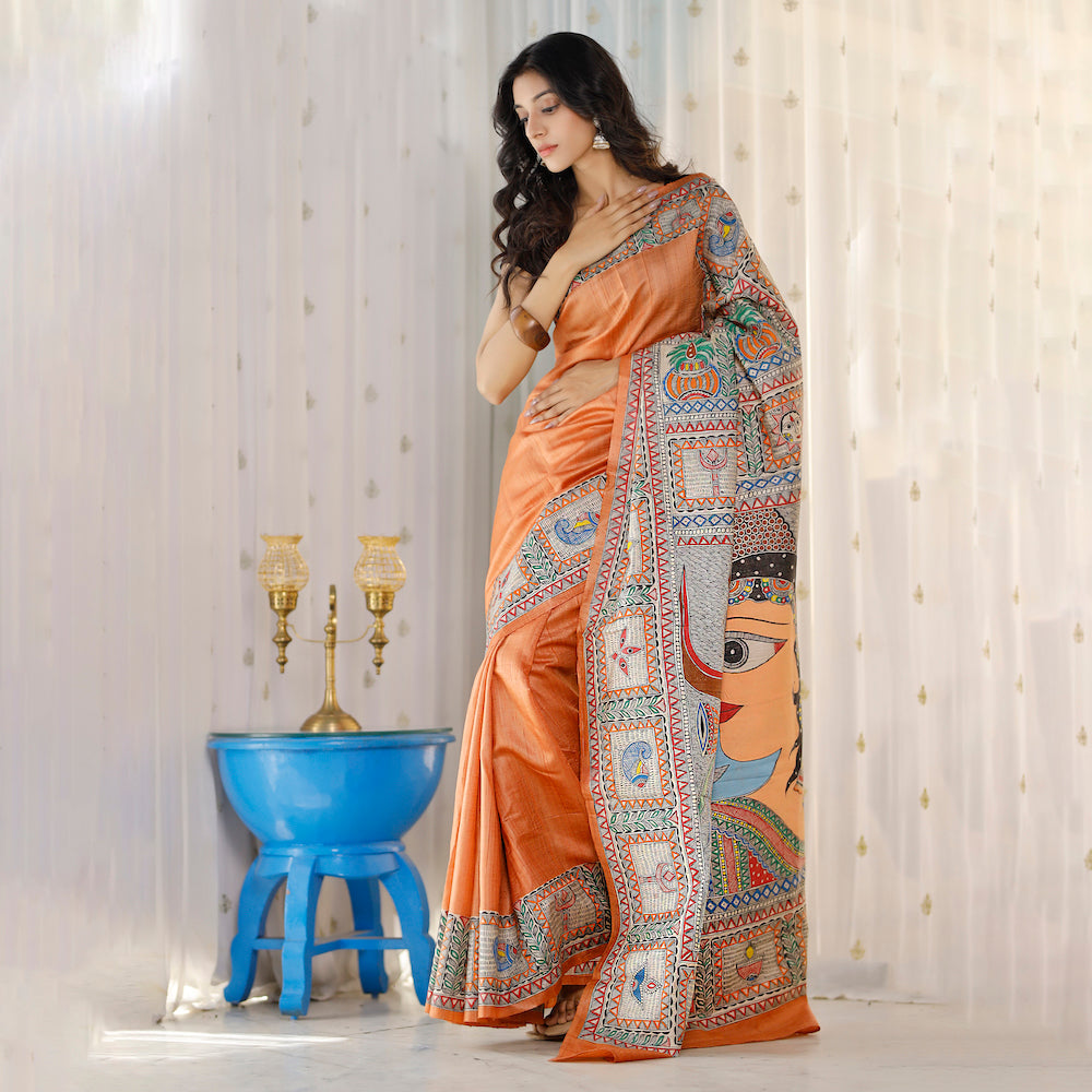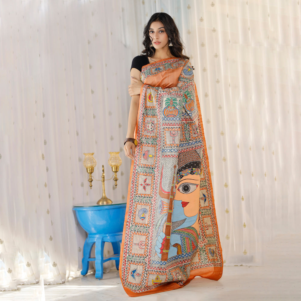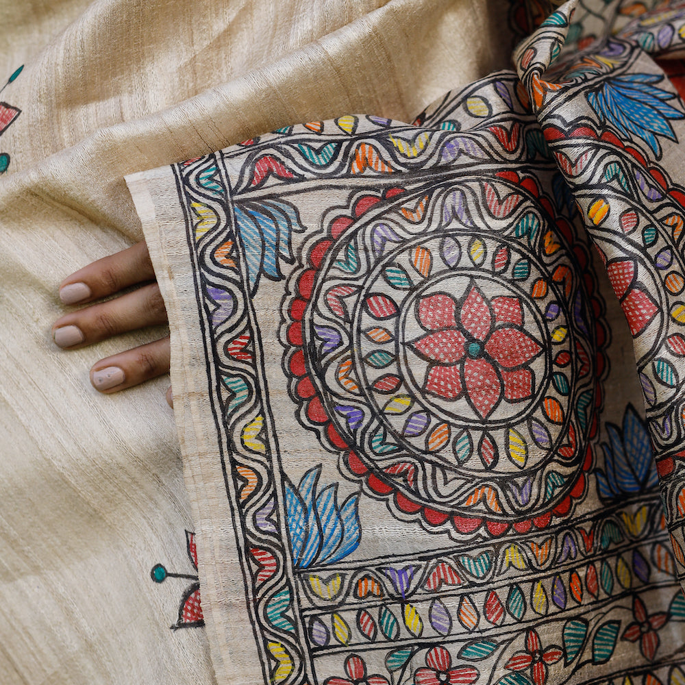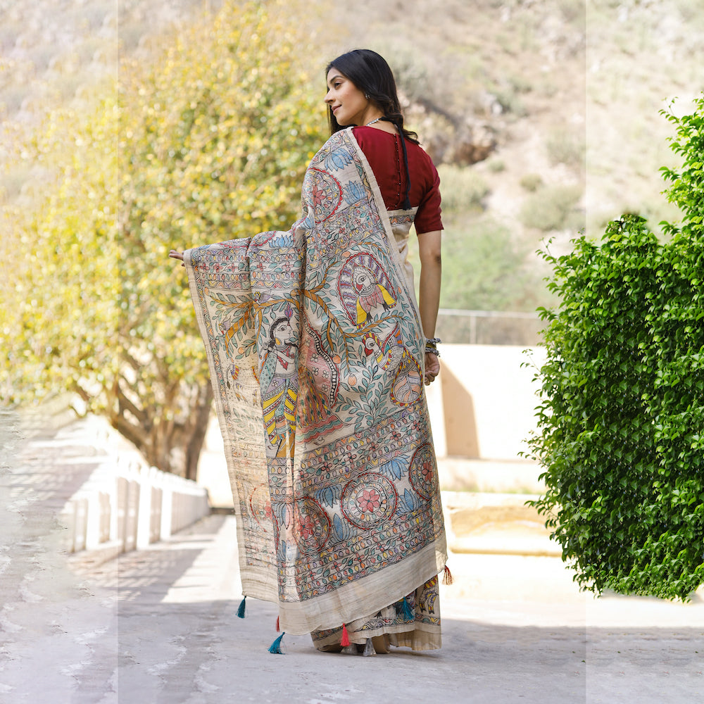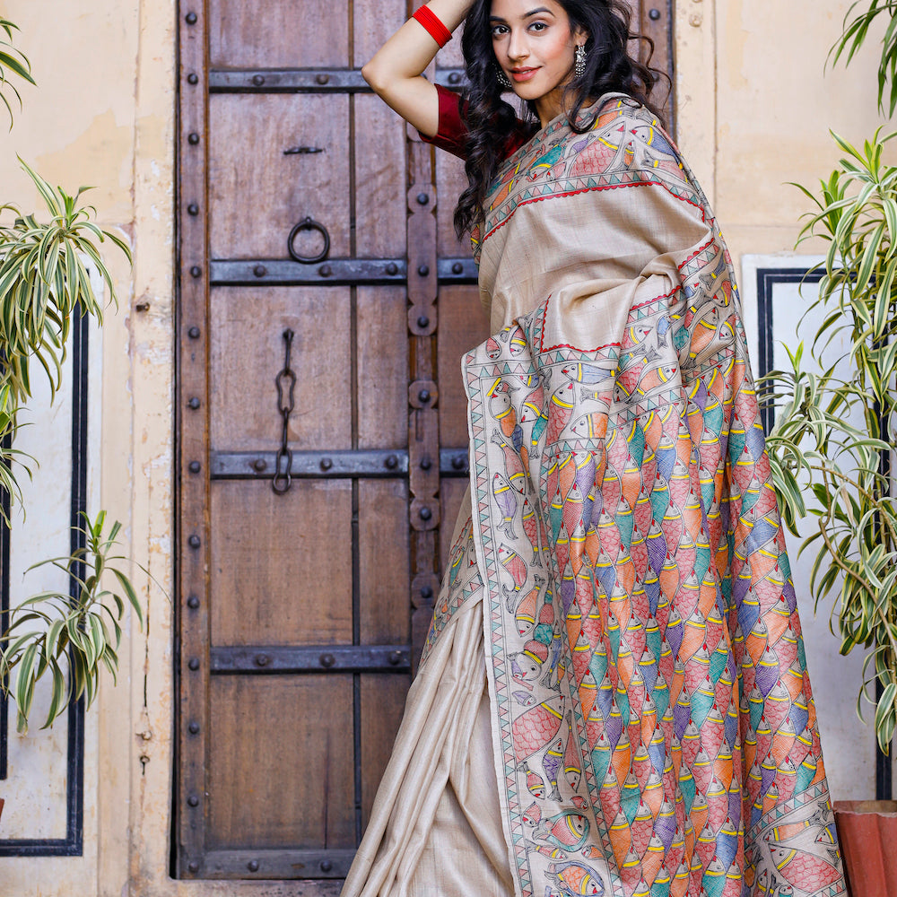 Madhubani Hand-Painted Matasya Tussar Silk Saree
