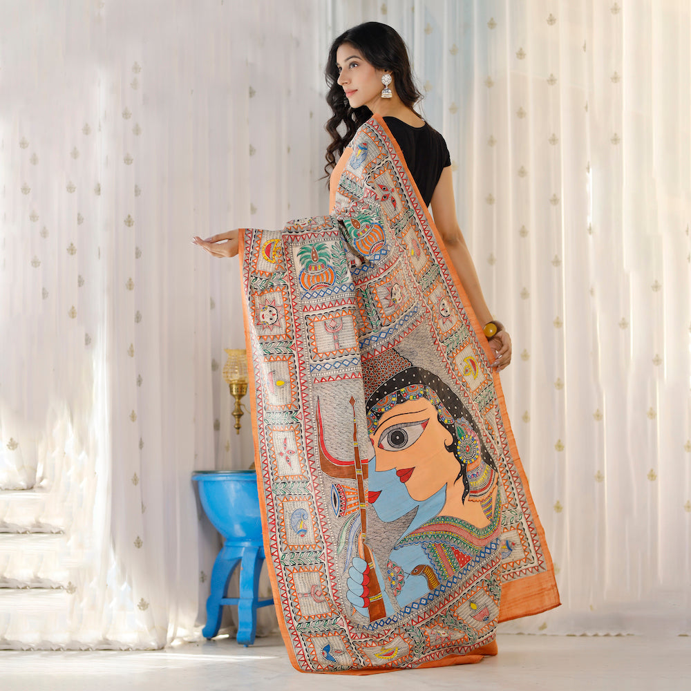 Madhubani Hand-Painted Durga Incarnations Tussar Ghicha Silk Saree