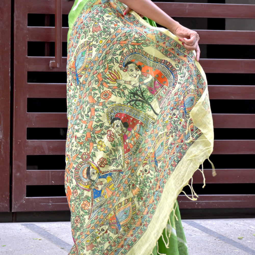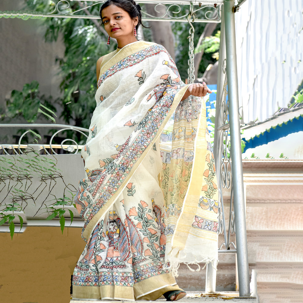 Madhubani "Radha Sang Krishna Holi " Hand-Painted Linen Saree