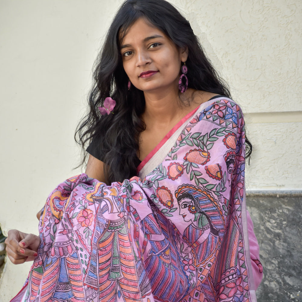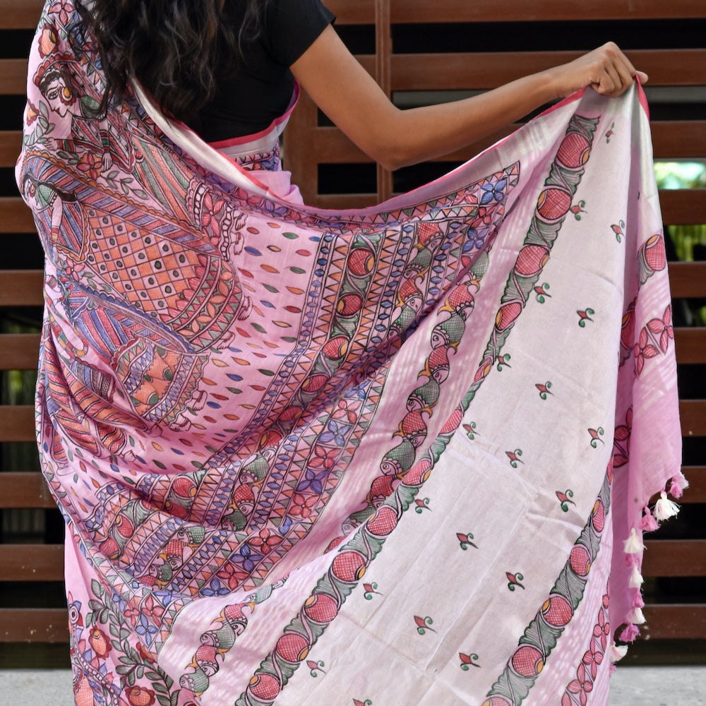 Madhubani Handpainted Floral Handapainted Linen Saree