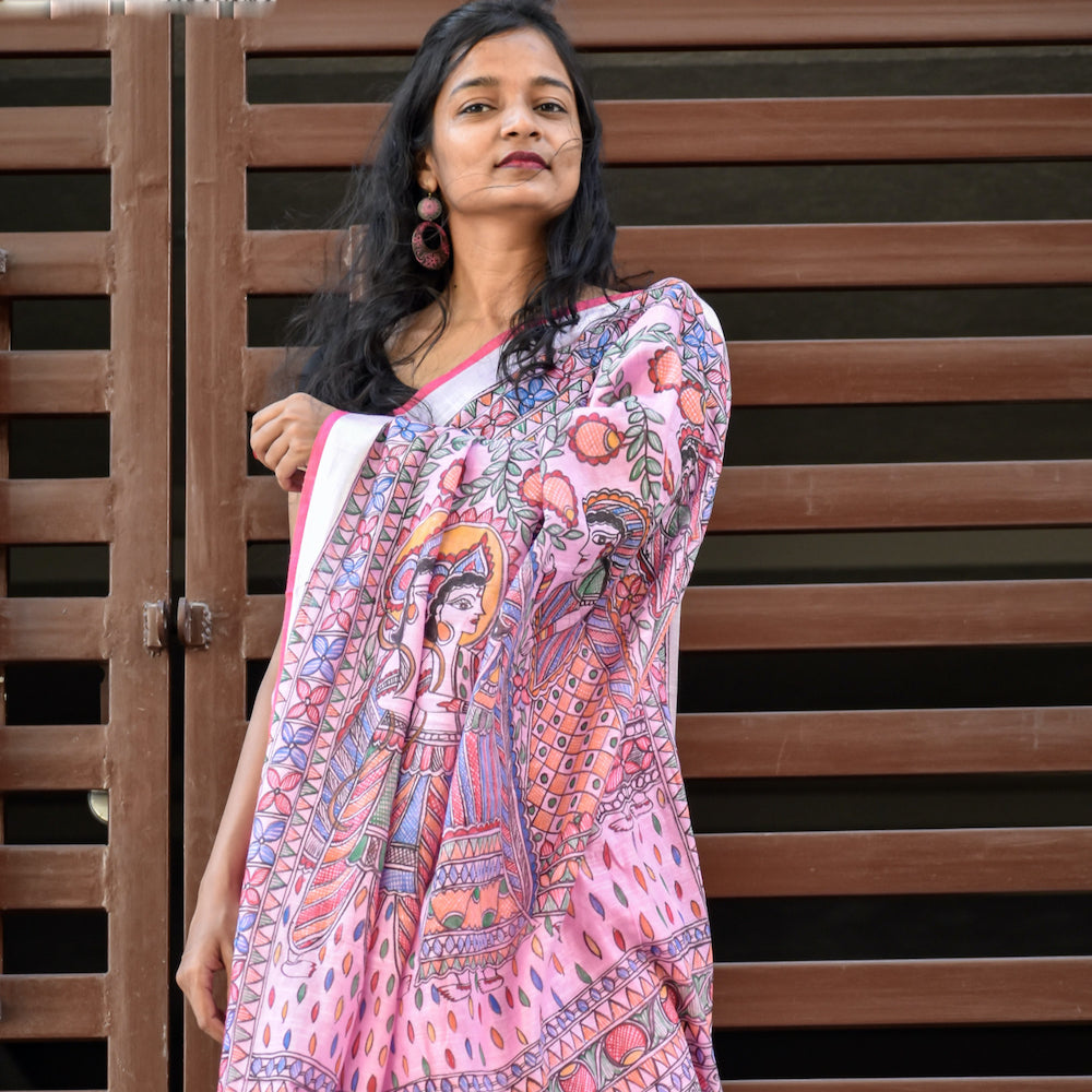 Madhubani "Simple Rural Life" Handloom Cotton Mulberry Silk Saree