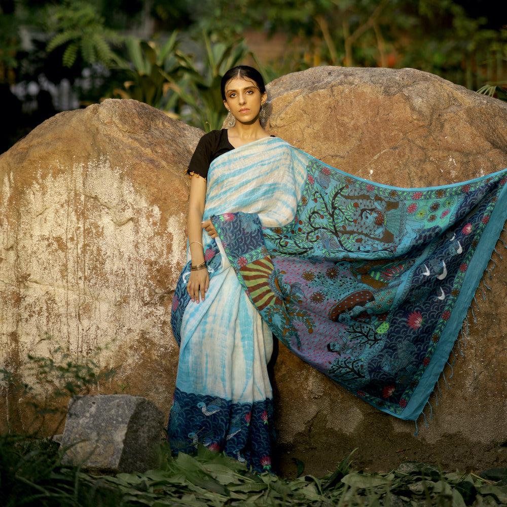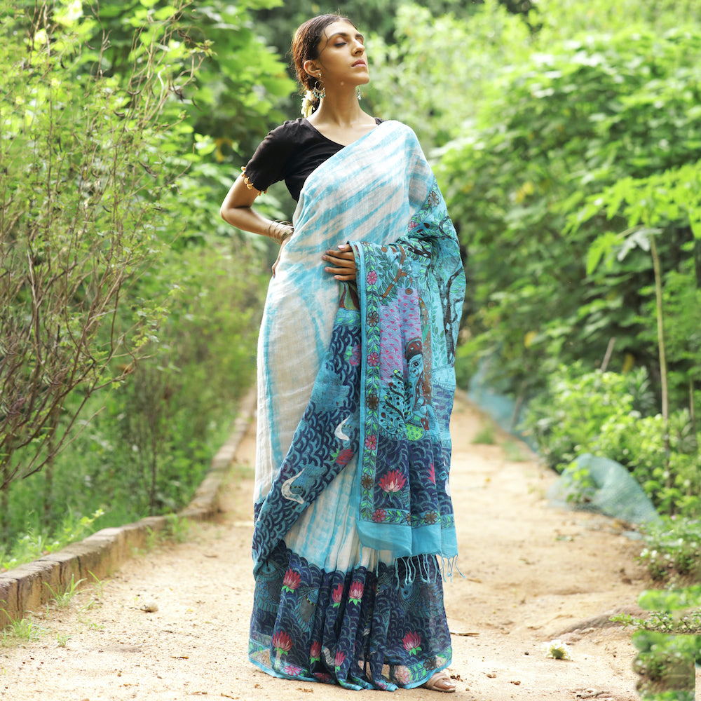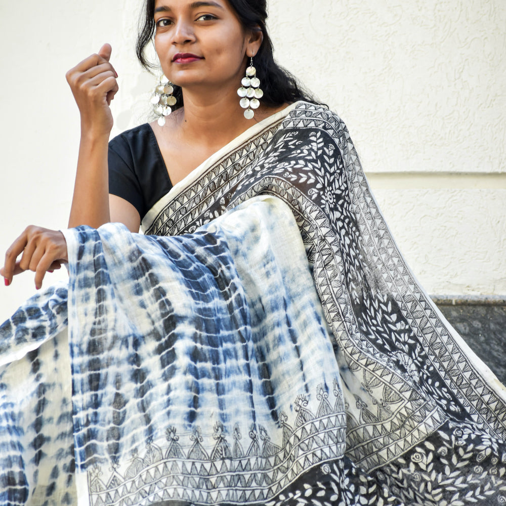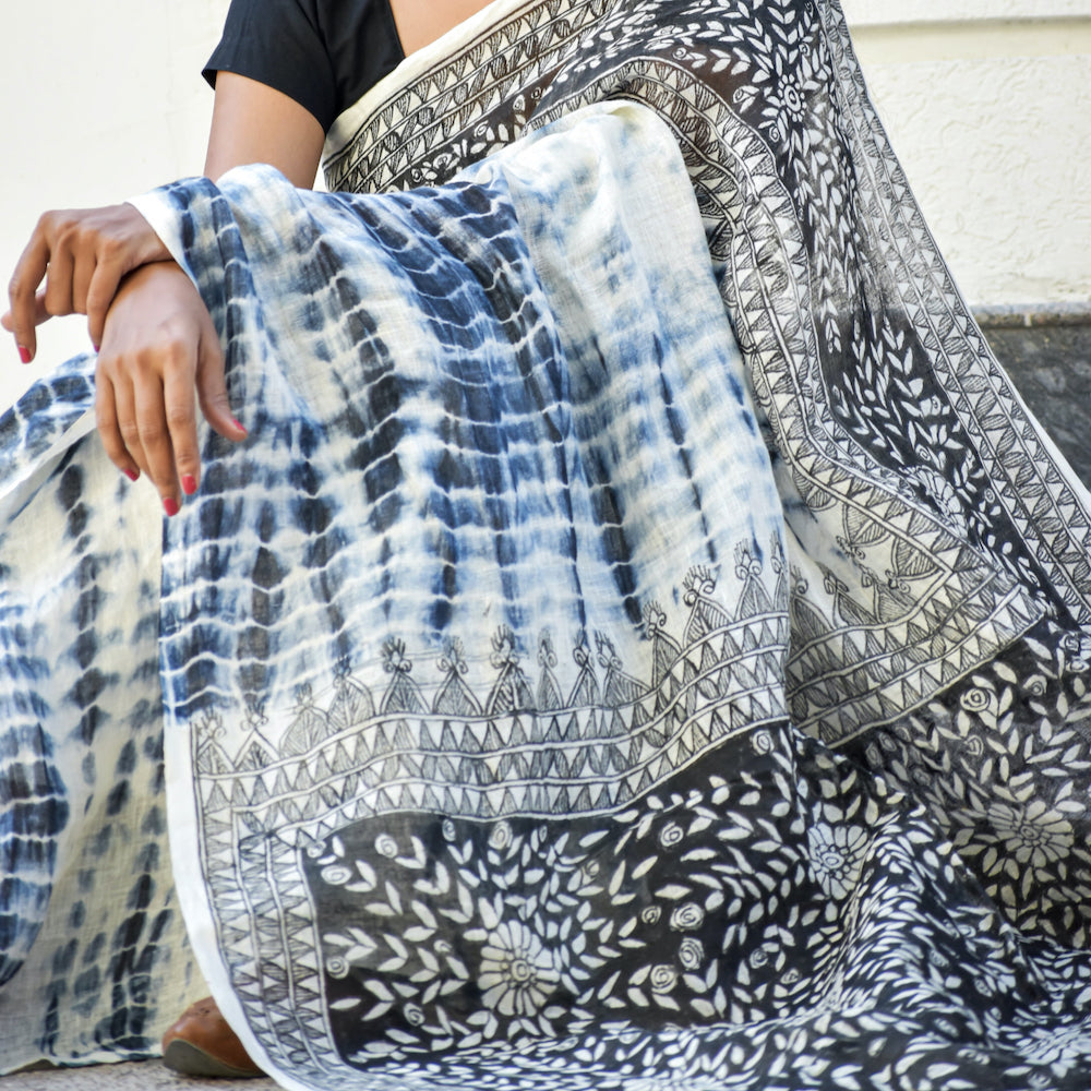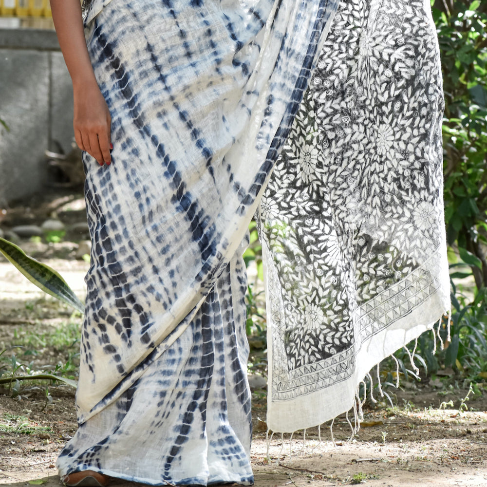 Madhubani Shibori Hand-Painted "Serene" Linen Saree