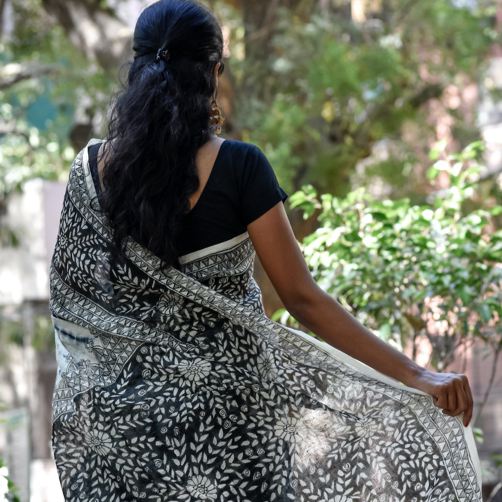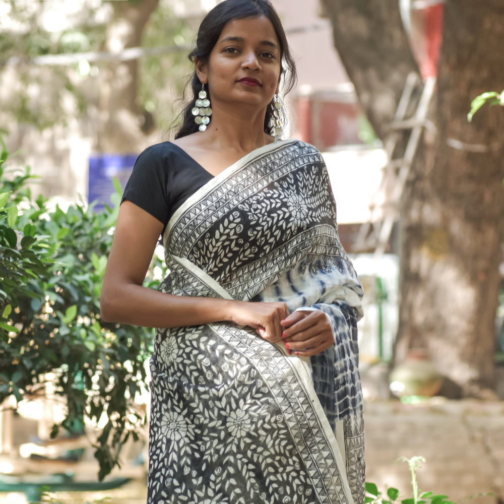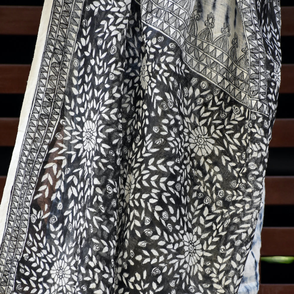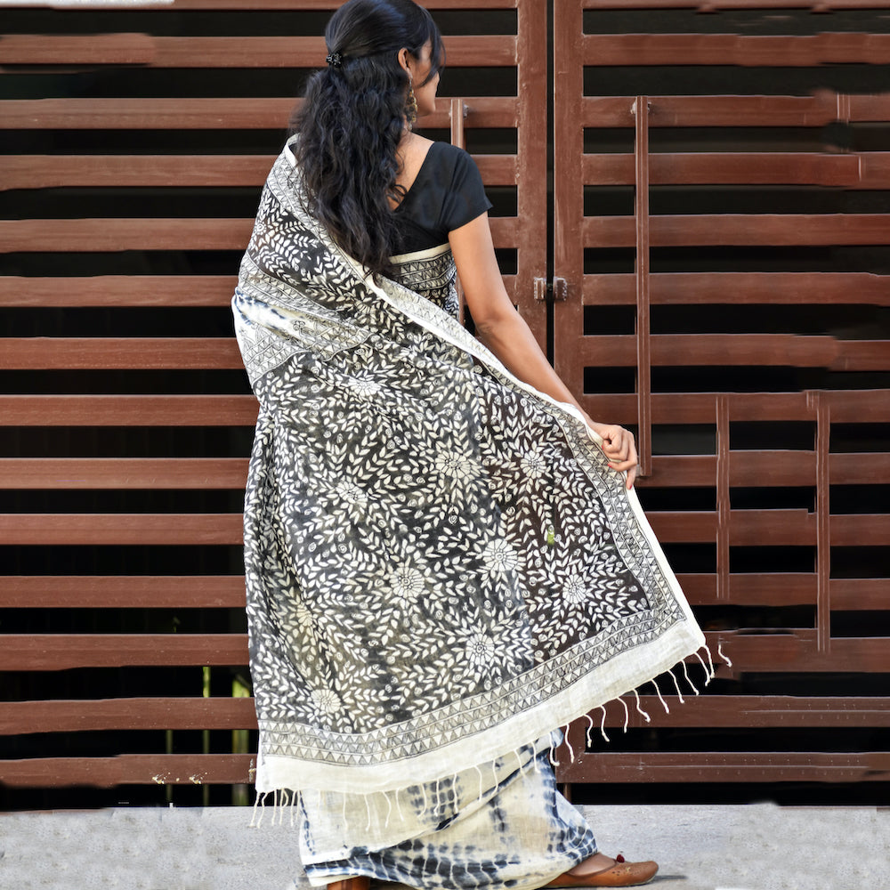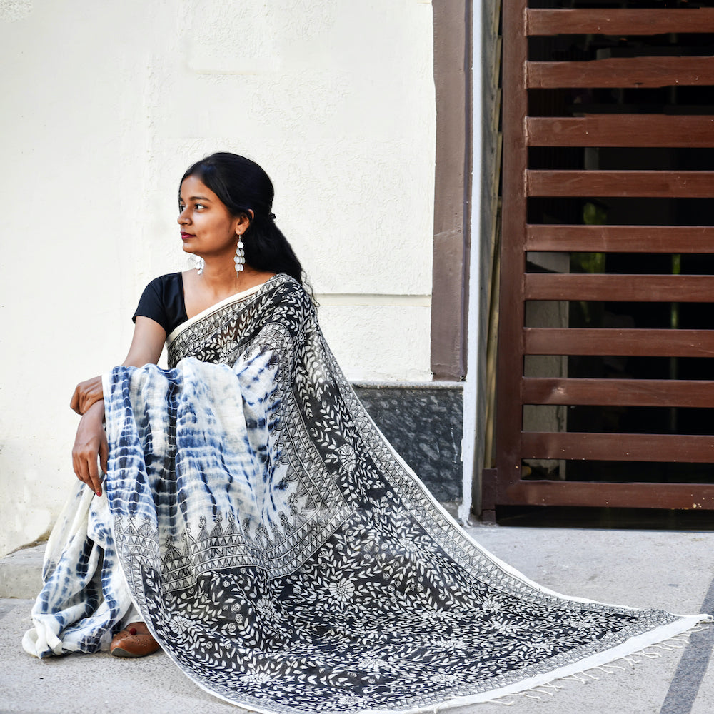Madhubani Shibori Hand-Painted "Serene" Linen Saree