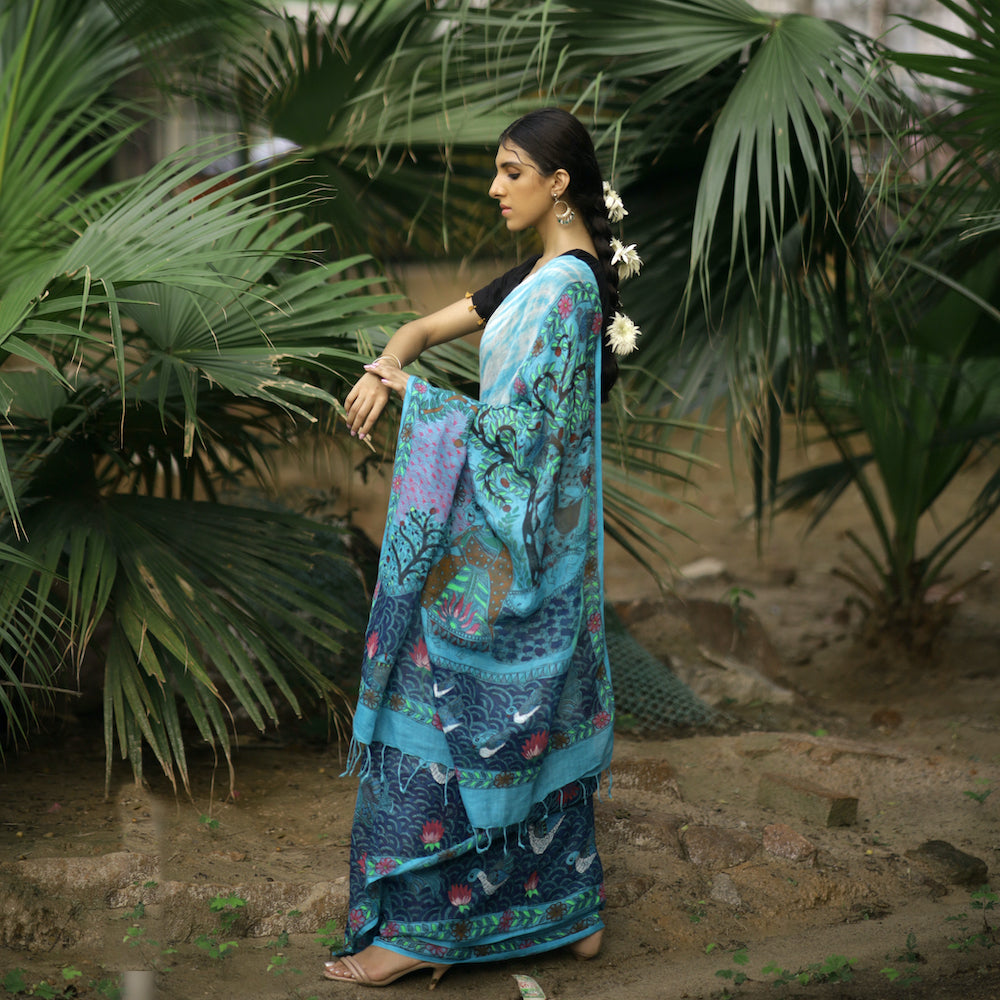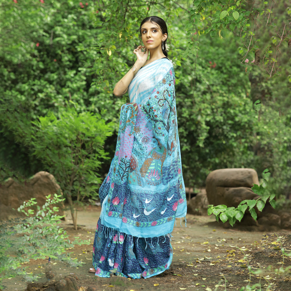 Madhubani Shibori Sky Blue Hand-Painted Linen Saree