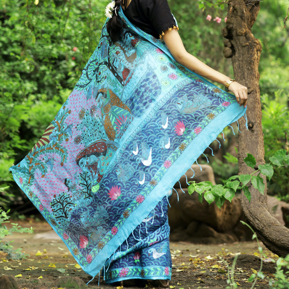 Madhubani Blue Tussar Silk Hand-Painted Saree