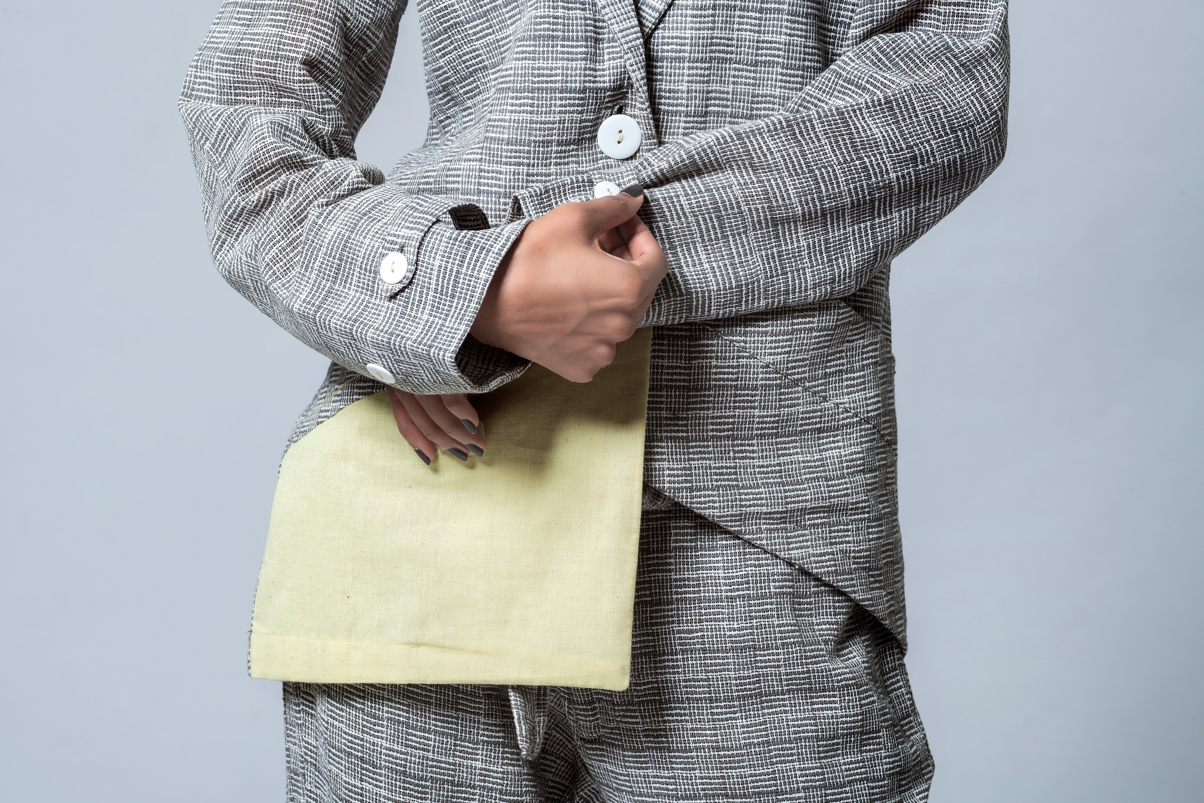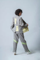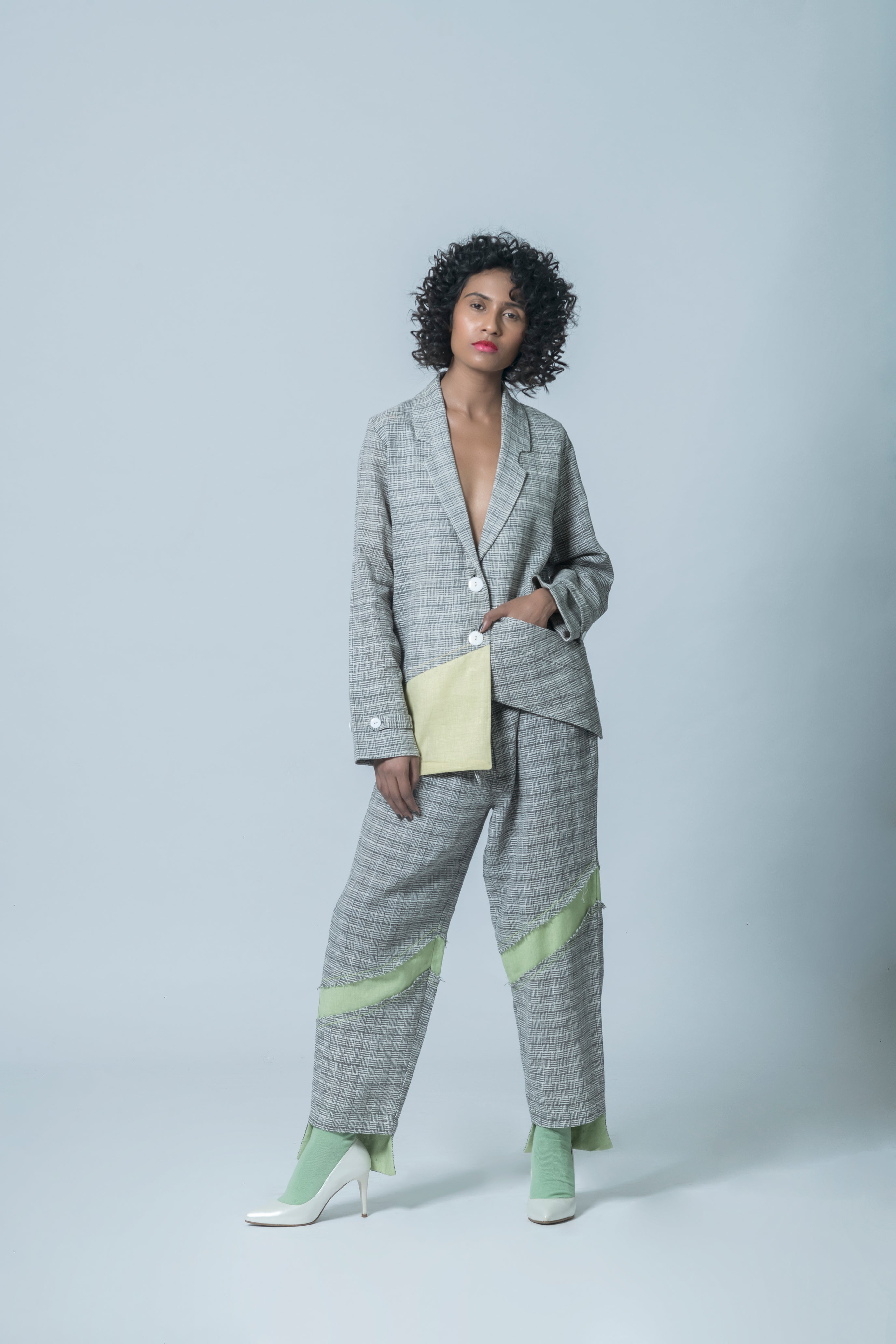 Refined elegance, outerwear with a classic shape and fit with asymmetric hem. Patched with lemon handwoven cotton adding summer freshness to 'Period Play'.