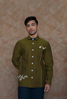 Description: A relaxed fit shirt in earthy olive looks great when paired with shorts and cropped pants. It features a cropped collar, indigo color blocking, topstitch detail and floral woollen thread embroidery. Made in handwoven cotton for breathable comfort.
