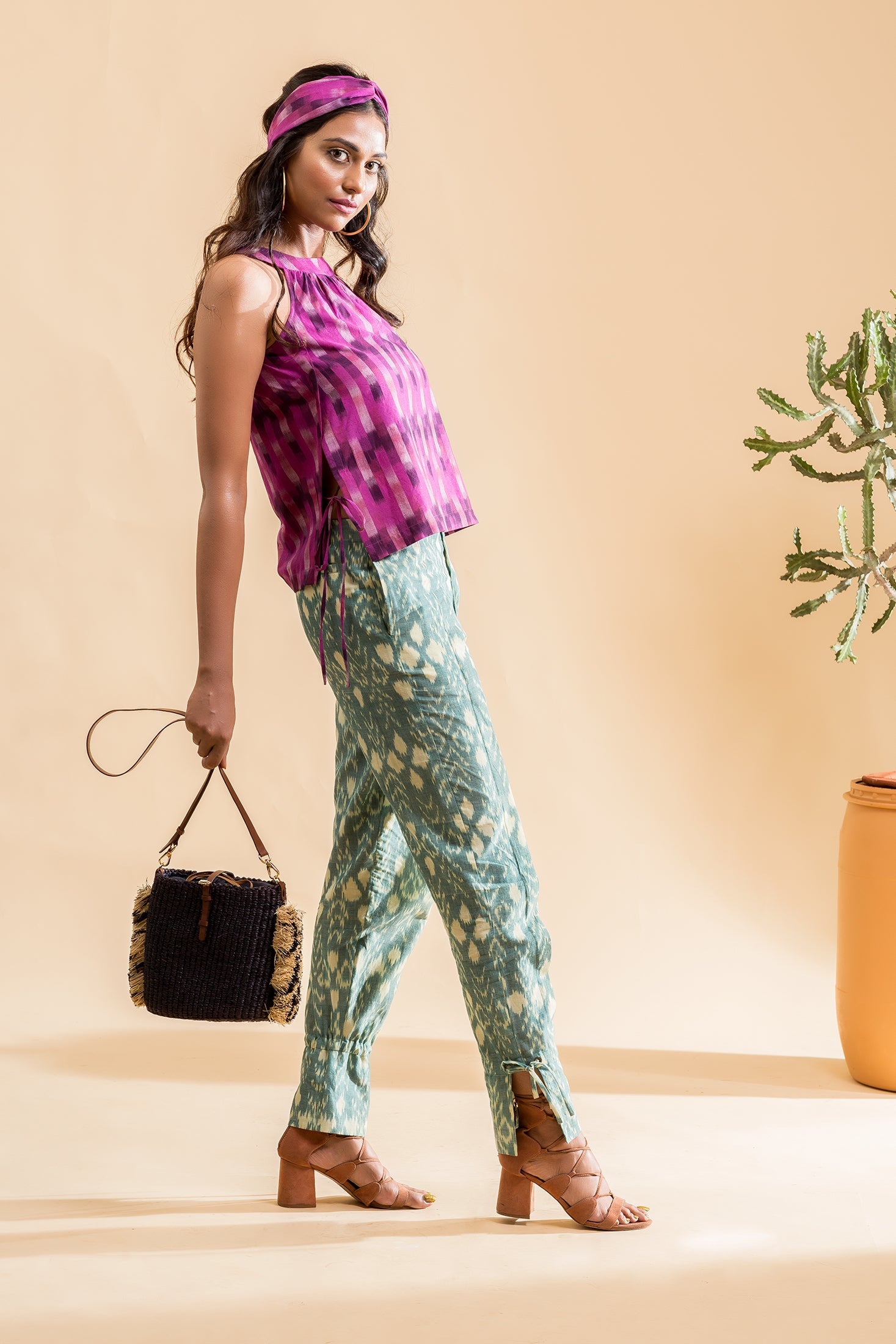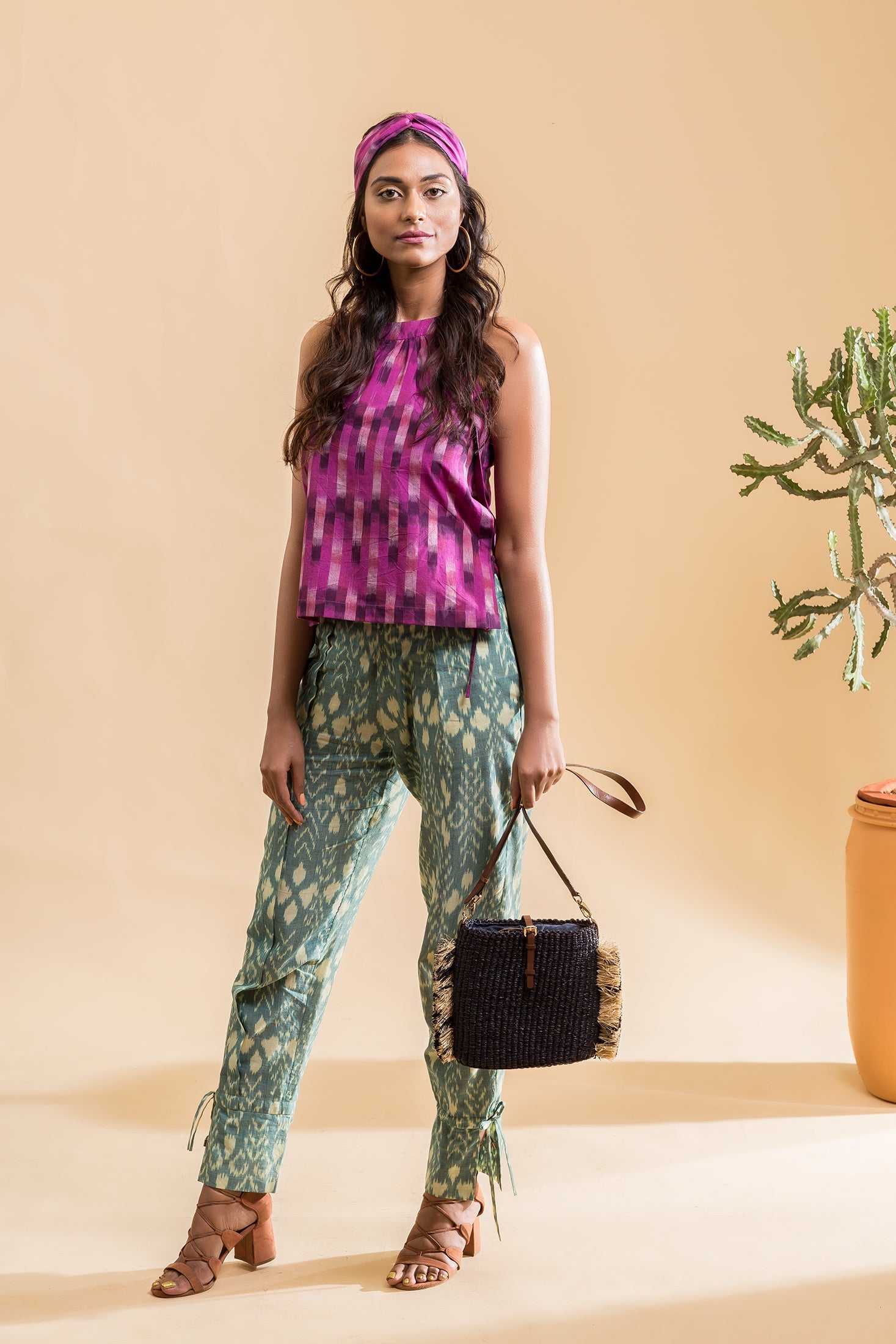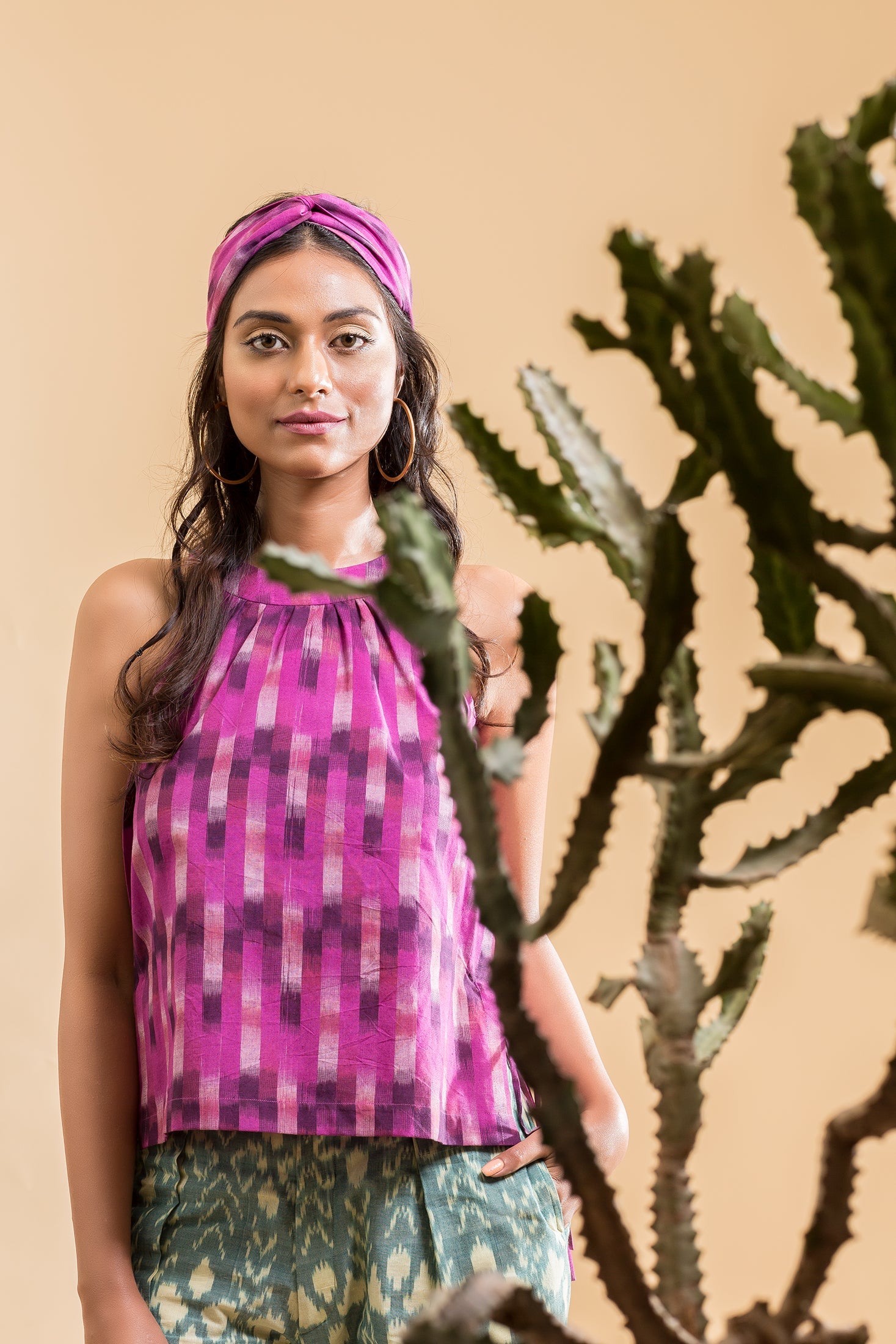 Description: Fluid shape and hidden details of this ikat Halter Neck Top is a must-have for your resort vacation this season.