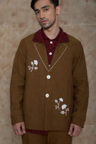 Description: This umber jacket with a maroon color block collar, topstitch detail, asymmetric welt pockets and floral embroidery will get you covered for your festive needs. It’s the jacket you want to reach out to again and again.