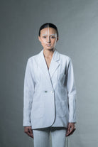 Description: This jacket with front darts, pockets and asymmetric box pleat cuffs is a contemporary approach to suiting.