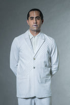 Description: A crisp white jacket constructed of handwoven jute cotton with welt pockets and pin tucks to give it minimal details.