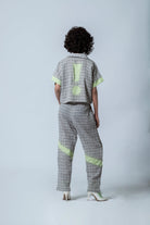 Underpinned by the collection's asymmetry, here is the cropped shirt with an off centre collar and curved placket. Made from jute cotton and handwoven cotton, this piece is perfect for the season, with mannish tailoring, reverse appliqué in the form of the exclamation with raw edges.