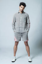 Description: An everyday style refreshed. These shorts with double knife pleats on one side are patched with bubblegum handwoven cotton in the form of brackets. Do not miss the top stitch and raw edge details!