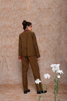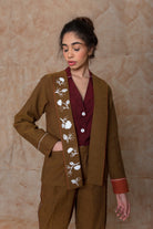 Description: Modern tailored jacket with an extended lapel, no buttons, asymmetric embroidery and back vent. Structured shape for day to night.