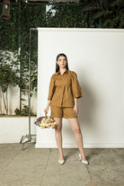 This shirt makes a delicate contrast to the more tailored pieces in this collection. It has drop shoulders with an overlay attached that can be tied at the back giving an illusion of layering. It is tailored with 3/4th flared sleeves with wide cuffs.