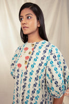 Description: This summery dress is cutest of all. It is a shift dress with a yoke and soft gathers at the back that makes it playful. The rose print placket with buttons is a noteworthy feature. In addition it also has in-seam pockets.