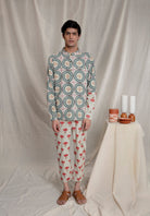 Description: Featuring a wide mandarin collar and half placket, this shirt is handcrafted in our tile print and is effortless to style. The rose print sleeve detail and rounded hems are noteworthy. It is a perfect combination of a traditional silhouette and fun print.