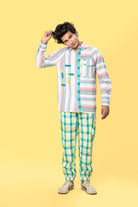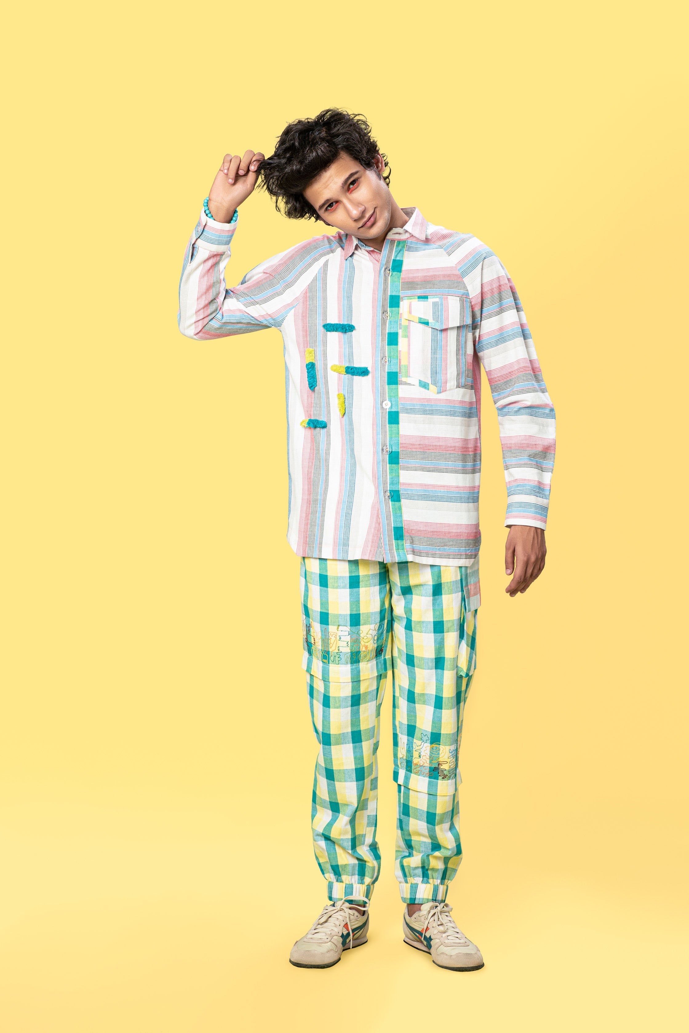 Description: Crafted in lightweight striped cotton, this shirt features humour with handmade fringes. It has an interesting placket and pocket detail. The sleeves are raglan and slightly rounded with darts giving them the shape. Bright, bold and beauteous.