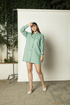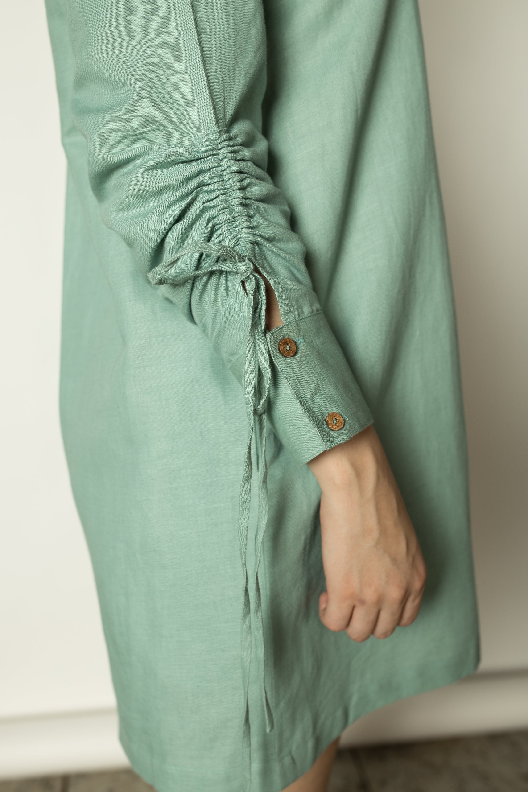 Description: This mini shirt dress is designed with ruched sleeves that is a subtle nod to this seasons romance trend. It features a regular collar in the front with a button at the back and a keyhole with knife pleats that adds volume to the A-line shape.