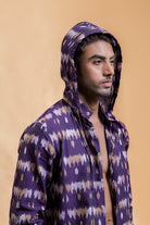 Description: This plum ikat print shirt has a hood with drawstring giving it the perfect resort feel.