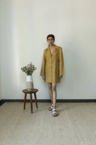 Description: This modern blazer in a dress form is key for the upcoming season. Made from a hemp cotton blend, it's expertly tailored with a peak lapel, lightly padded oversized shoulders in a slim, single-breasted silhouette with darts to cinch the waist.