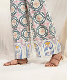 These wide legged trousers are roomy and most comfortable. The exaggerated cuffs with arch print make these a statement pair. Side pockets.