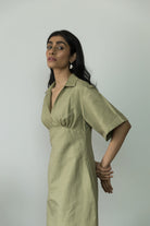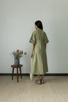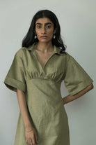 Description: The design team have revisited a classic from the archive, this time interpreting it in breathable hemp cotton. Cut for a midi length, this dress has a classic pointed collar, cinched waist and boxy cuff sleeves. The dropped shoulders and back slit help ease of movement.
