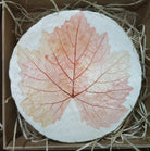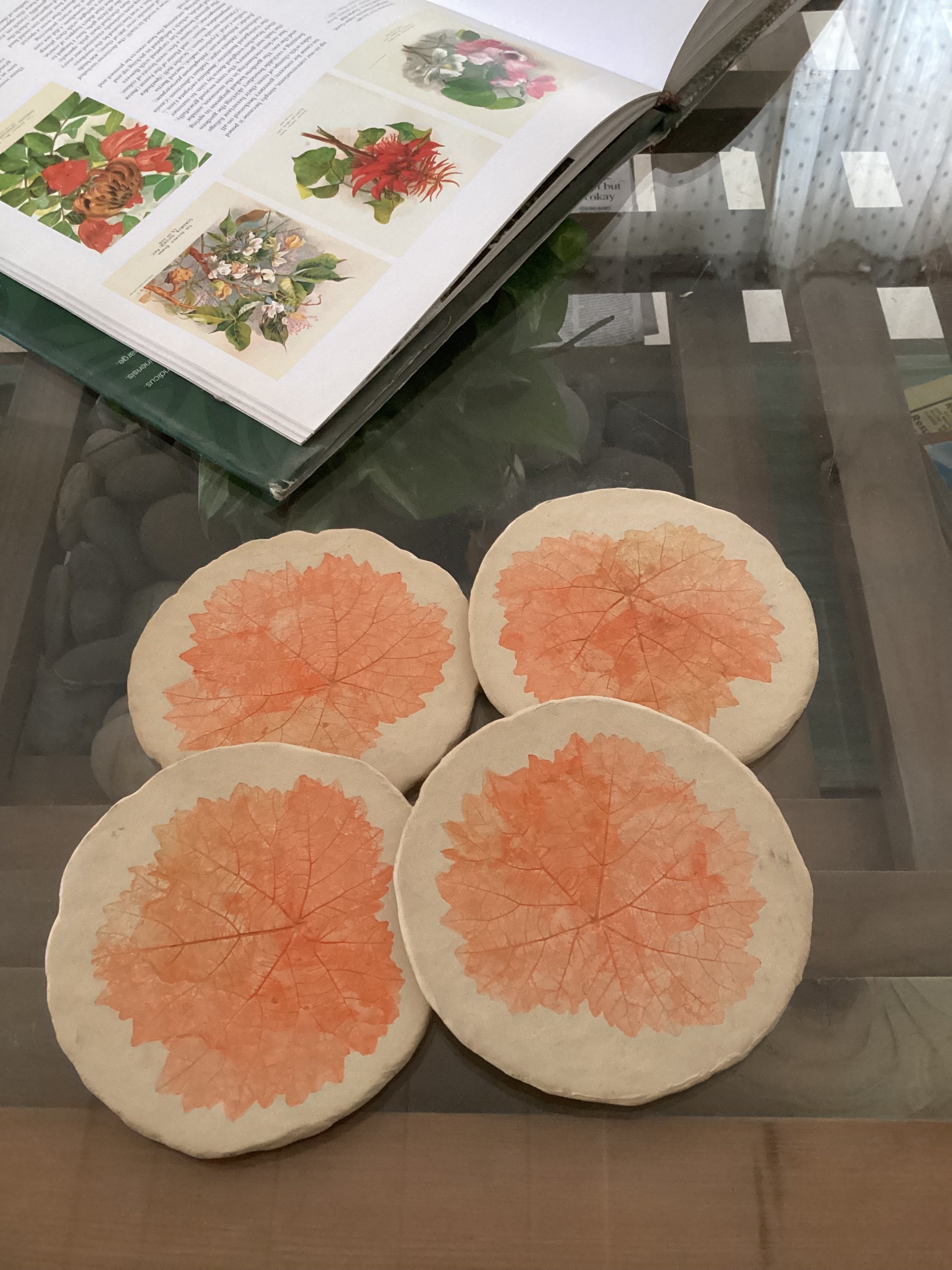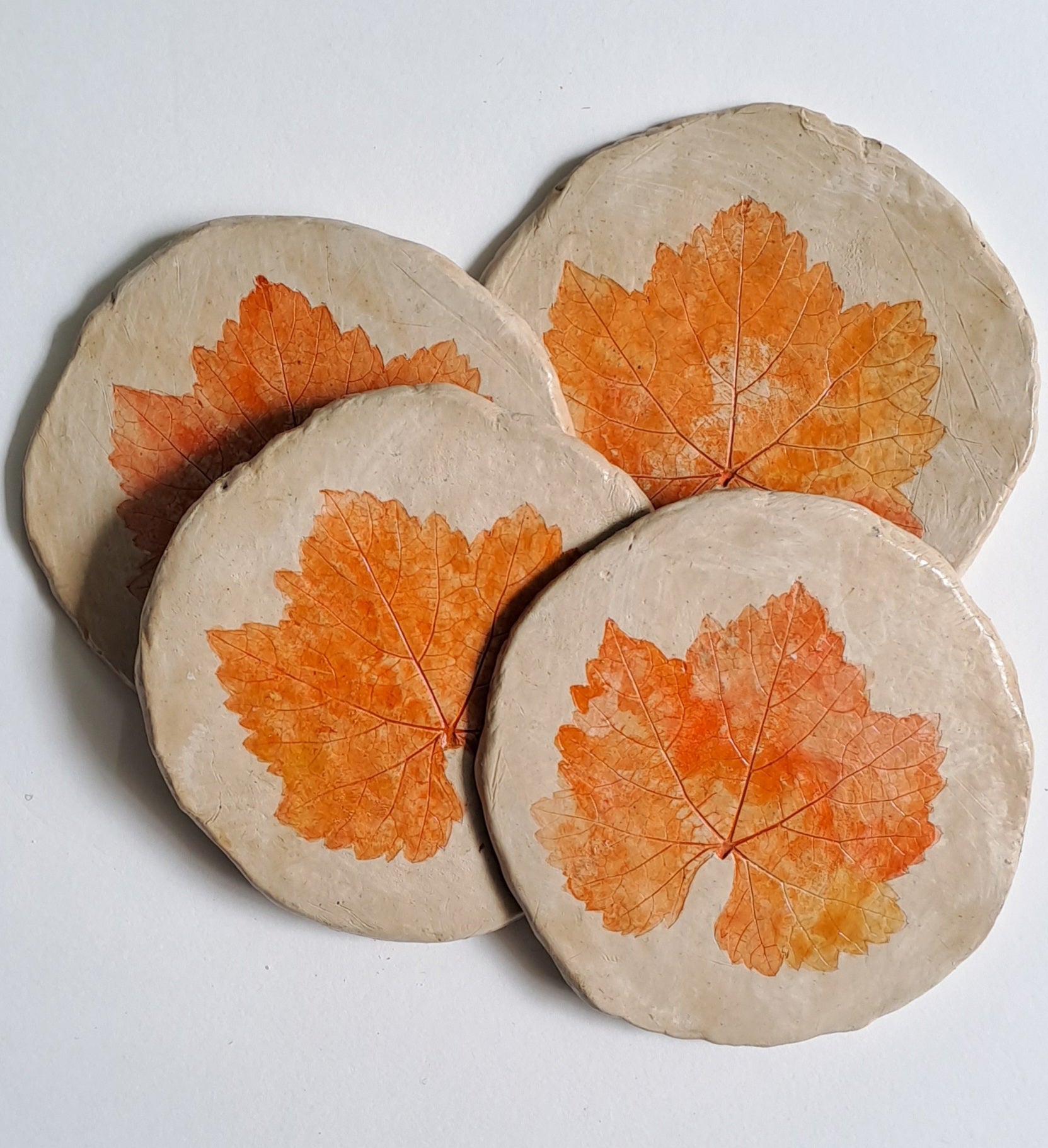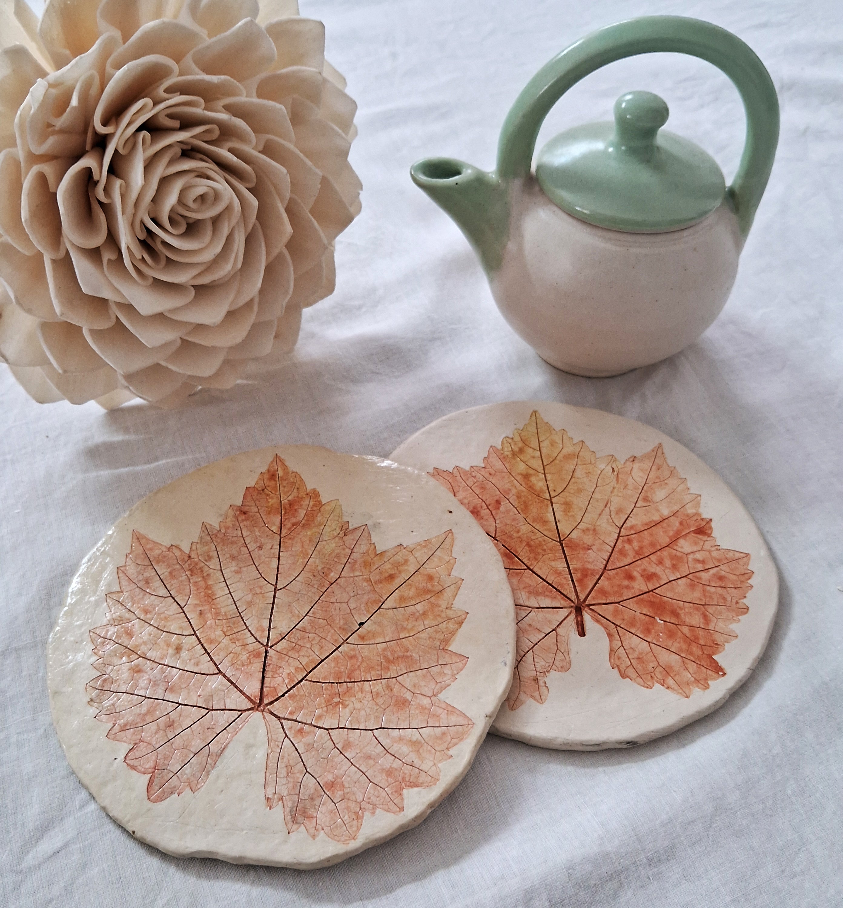 REAL grape LEAF IMPRINTED, HANDPAINTED COASTERS. Each piece is handcrafted, and then hand painted. Each pieces are coated with lacquer to prevent from water and has a cork sticker base to avoid scratch on table.