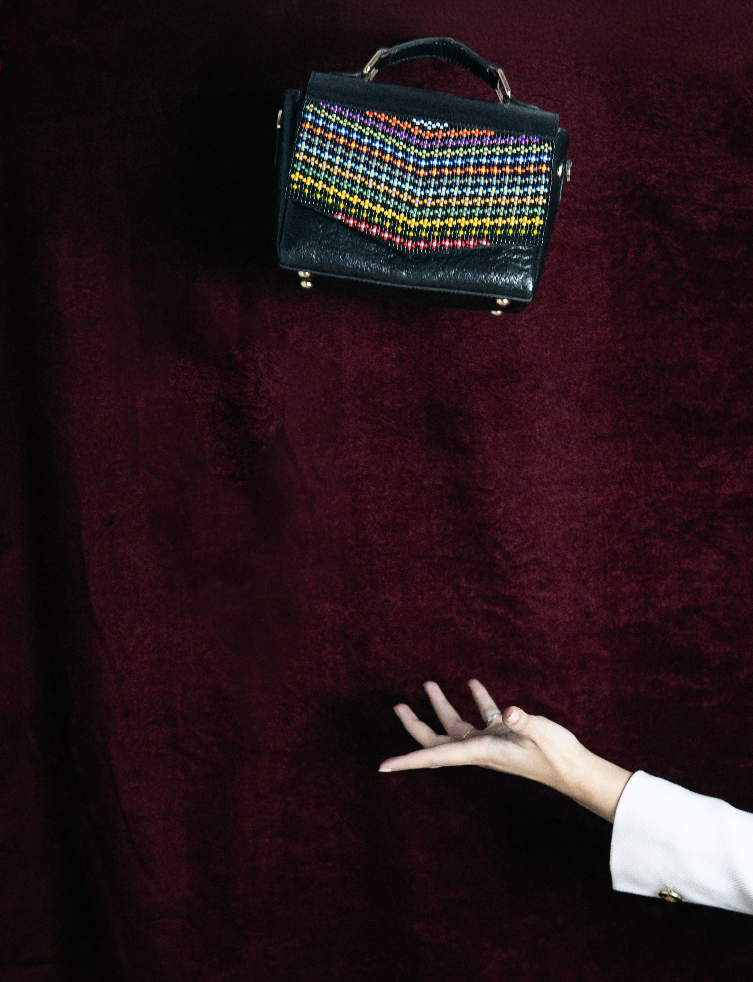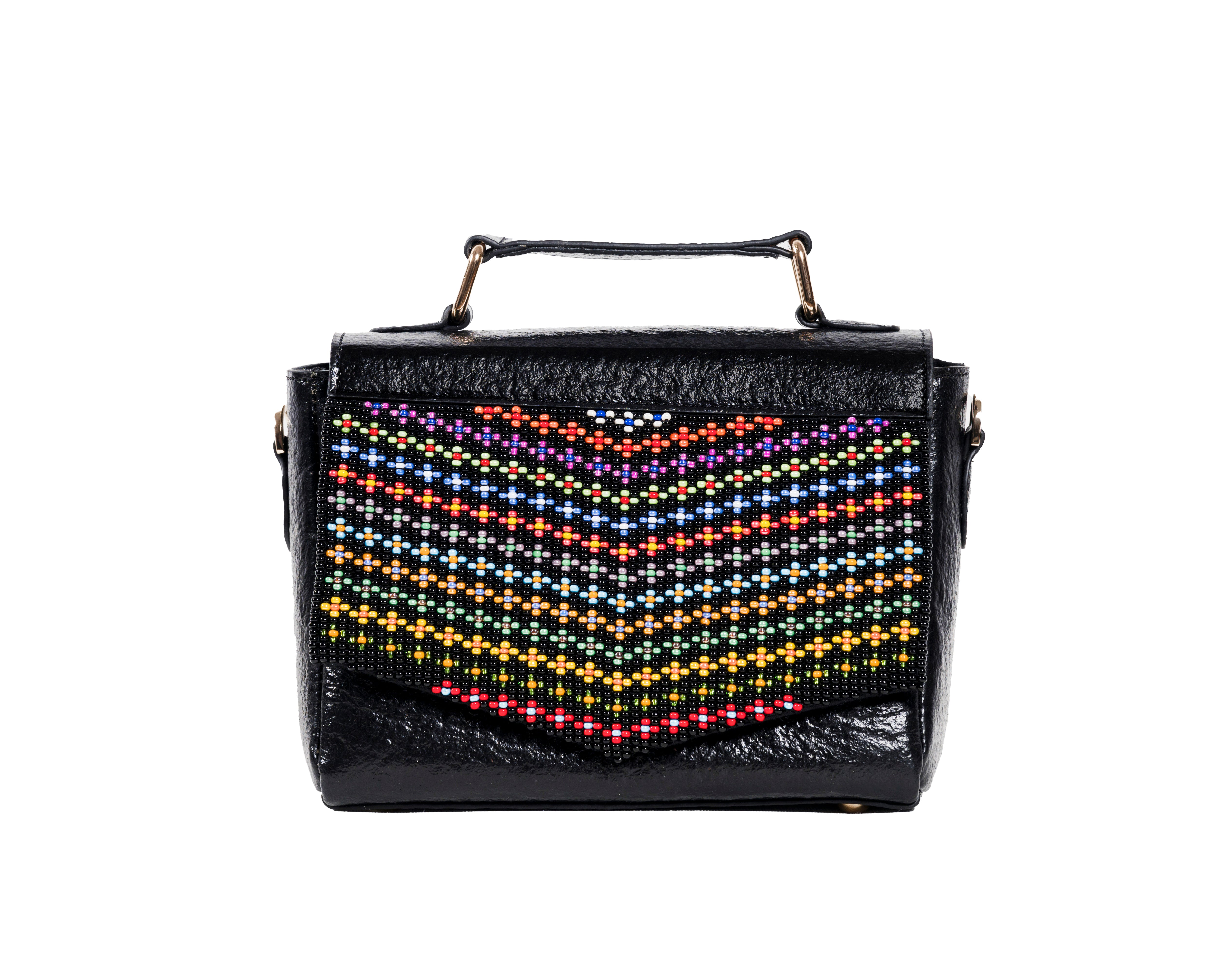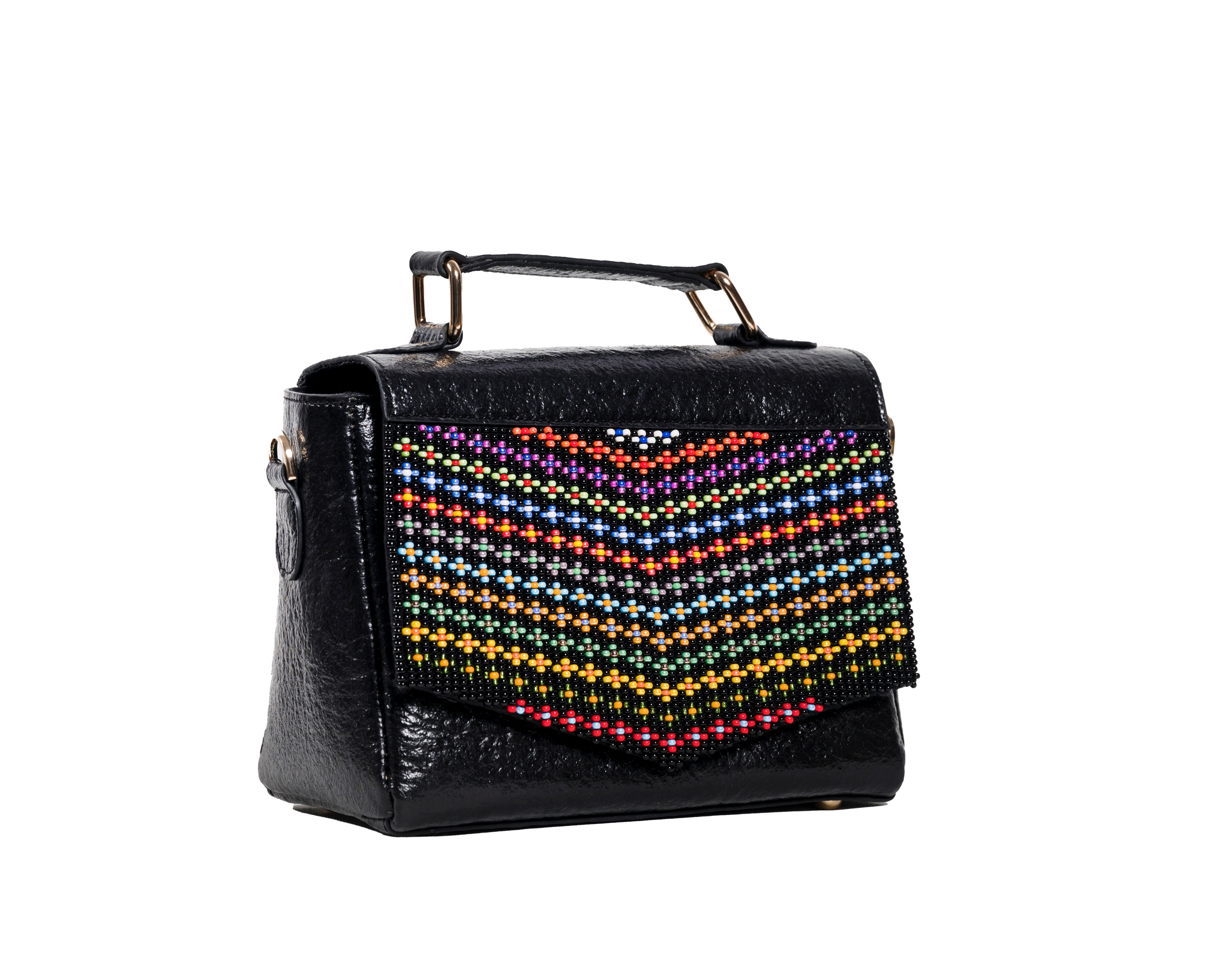 Product details: A stunning statement piece featuring a vibrant chevron pattern in rainbow hues against a classic black base. Handcrafted using traditional Czech glass beads, this purse showcases a mesmerizing gradient of colors that dance across the surface. The geometric design is inspired by traditional Gujarati Toran patterns, brought to life through meticulous beadwork by artisans from Saurashtra. Perfect for both day and evening wear, this structured handbag combines artisanal heritage with contemporary style.