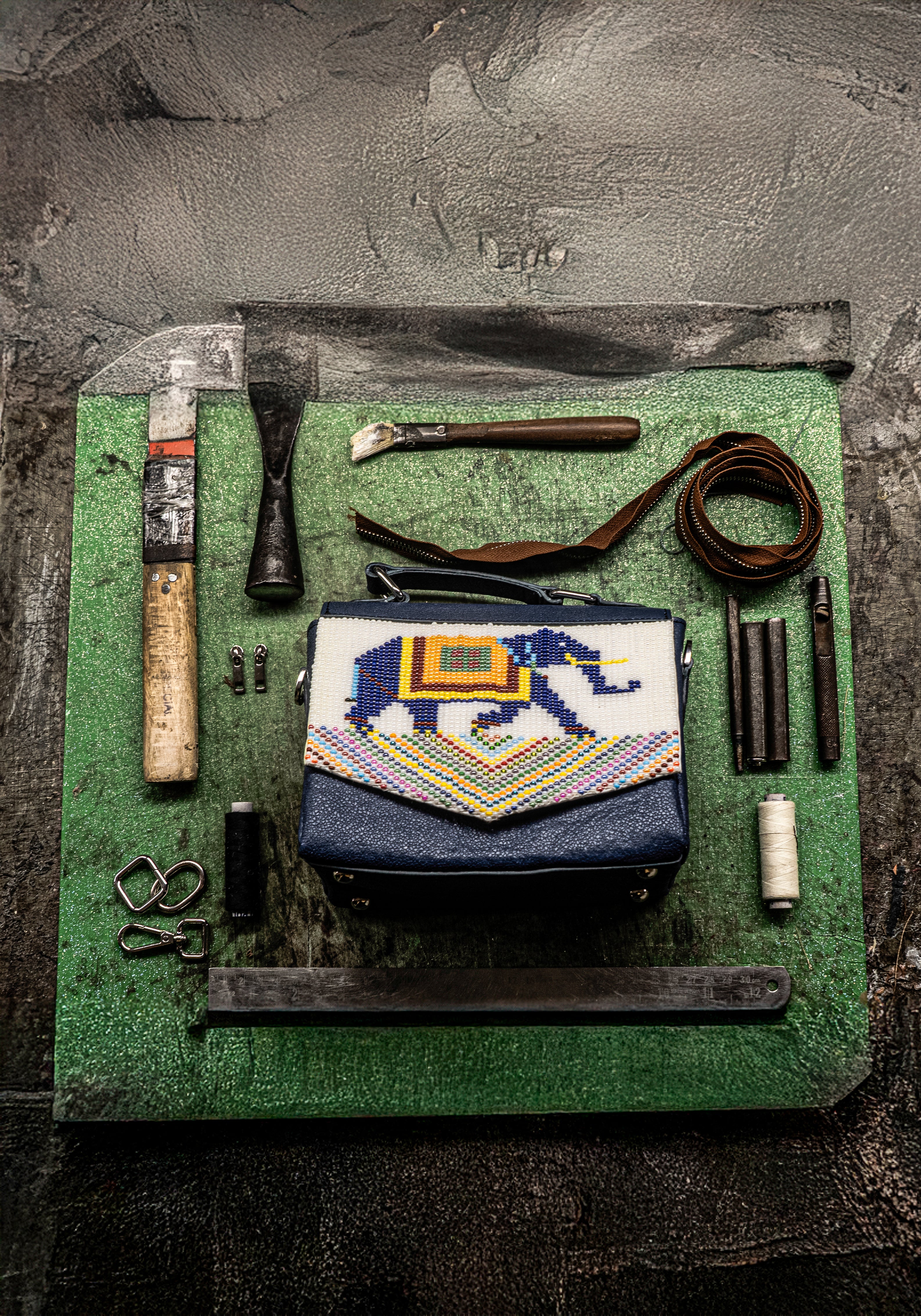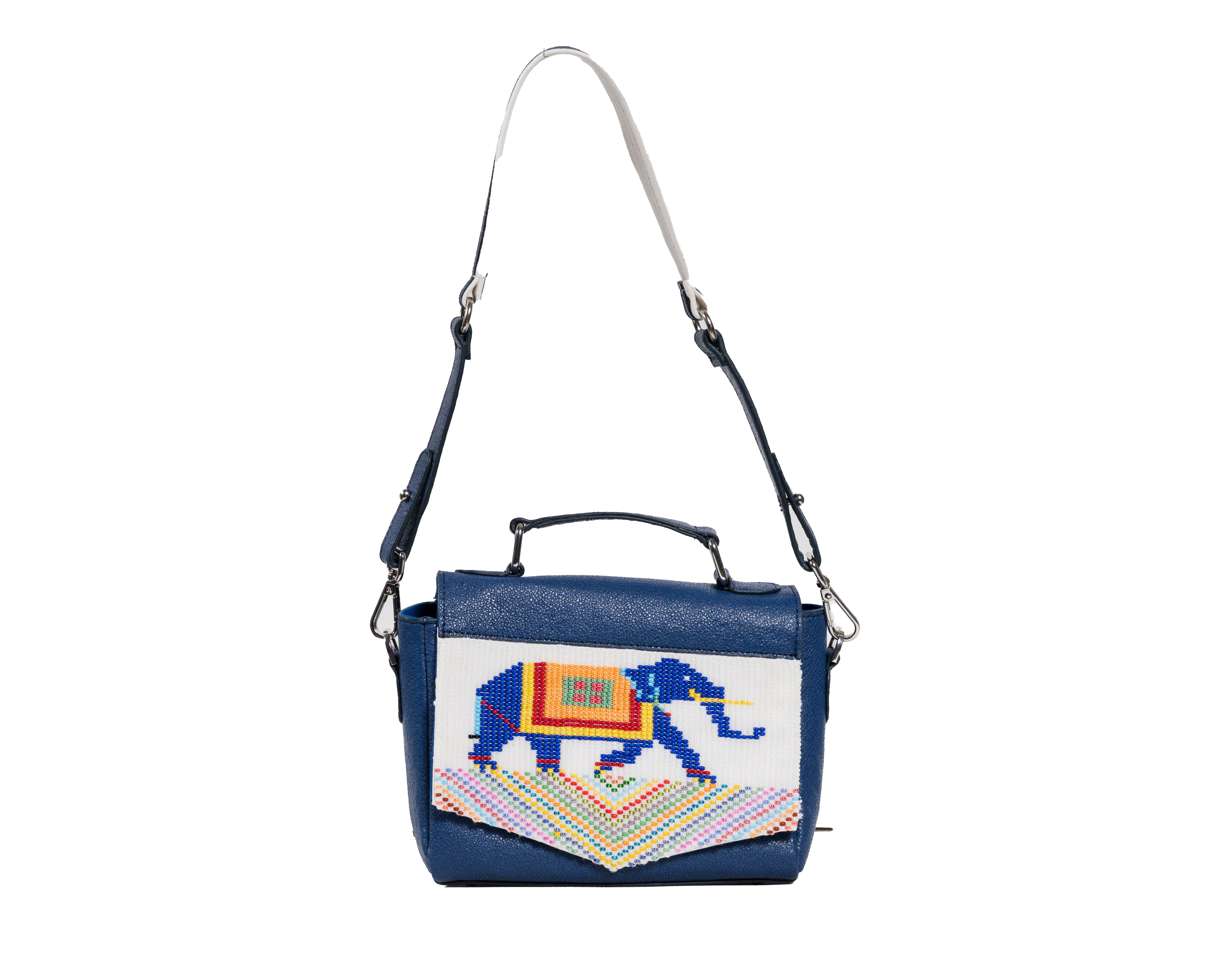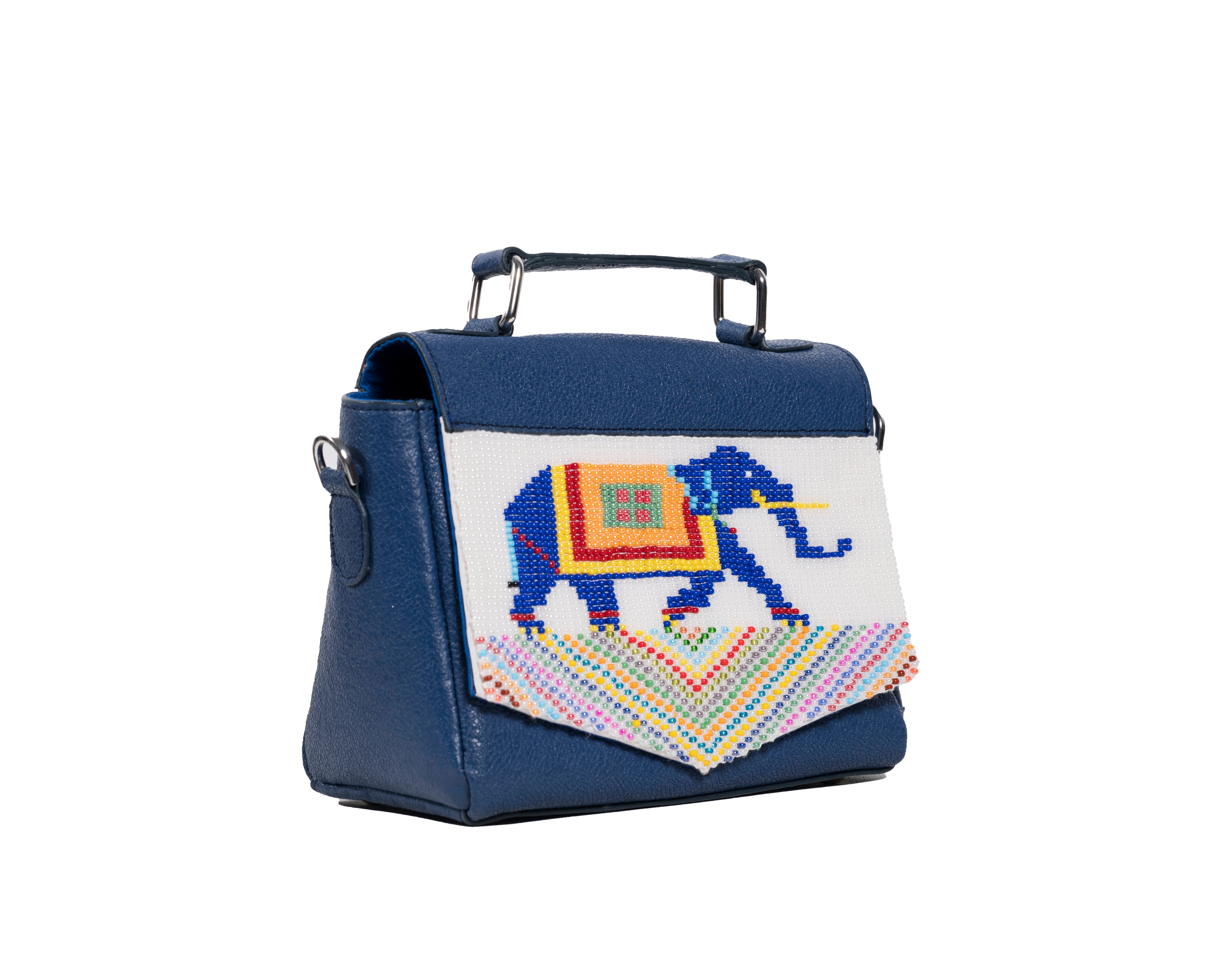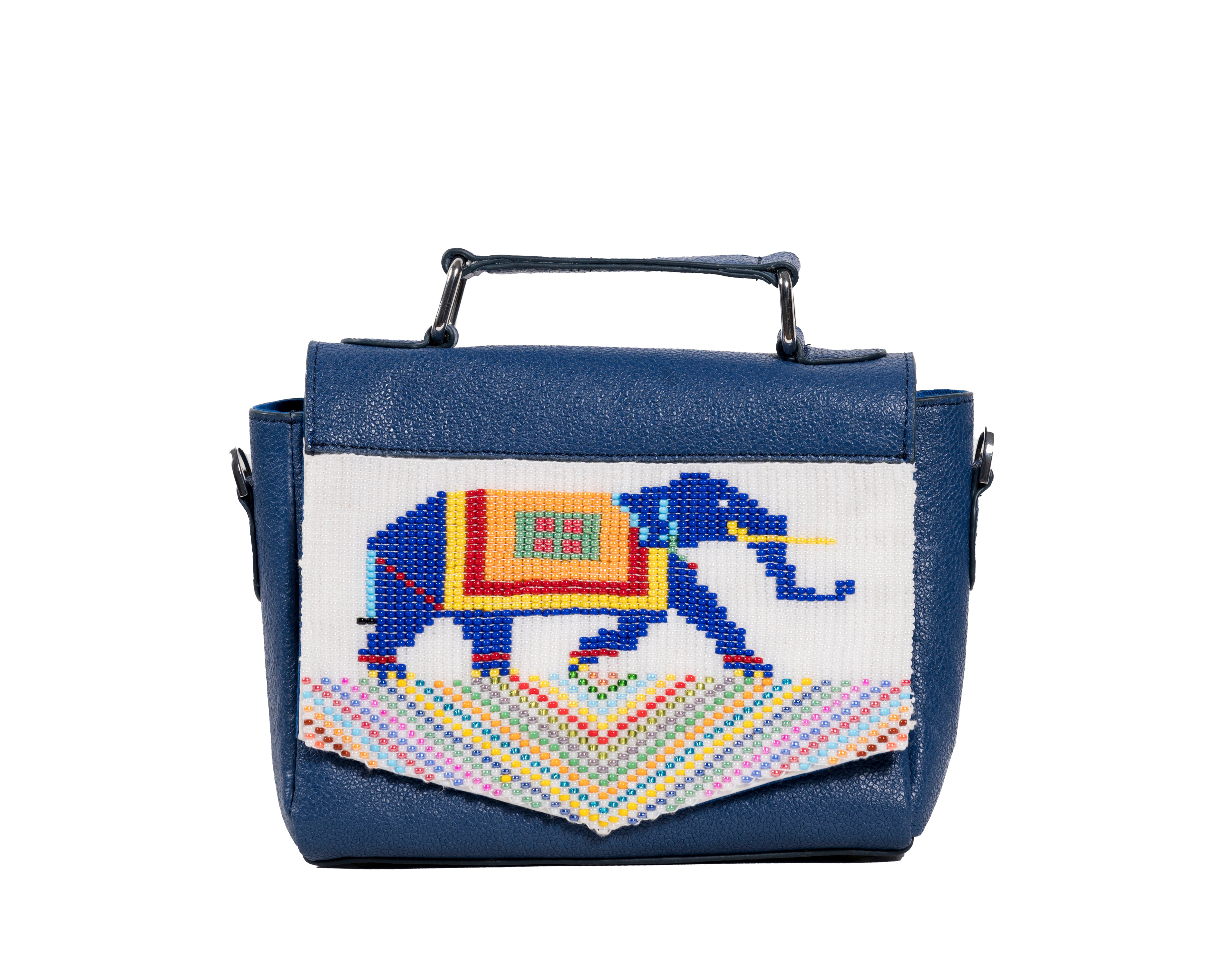 Product details: This whimsical design features a majestic elephant motif rendered in royal blue, adorned with traditional decorative elements in warm yellows and reds. Set against a navy blue leather background, the beadwork tells a story of India's rich cultural heritage through the iconic elephant symbol. The geometric patterns beneath the elephant echo traditional Toran designs, creating a perfect blend of narrative and decorative elements. Each bead is carefully placed by Saurashtra's artisans, making this purse a true collector's piece.
