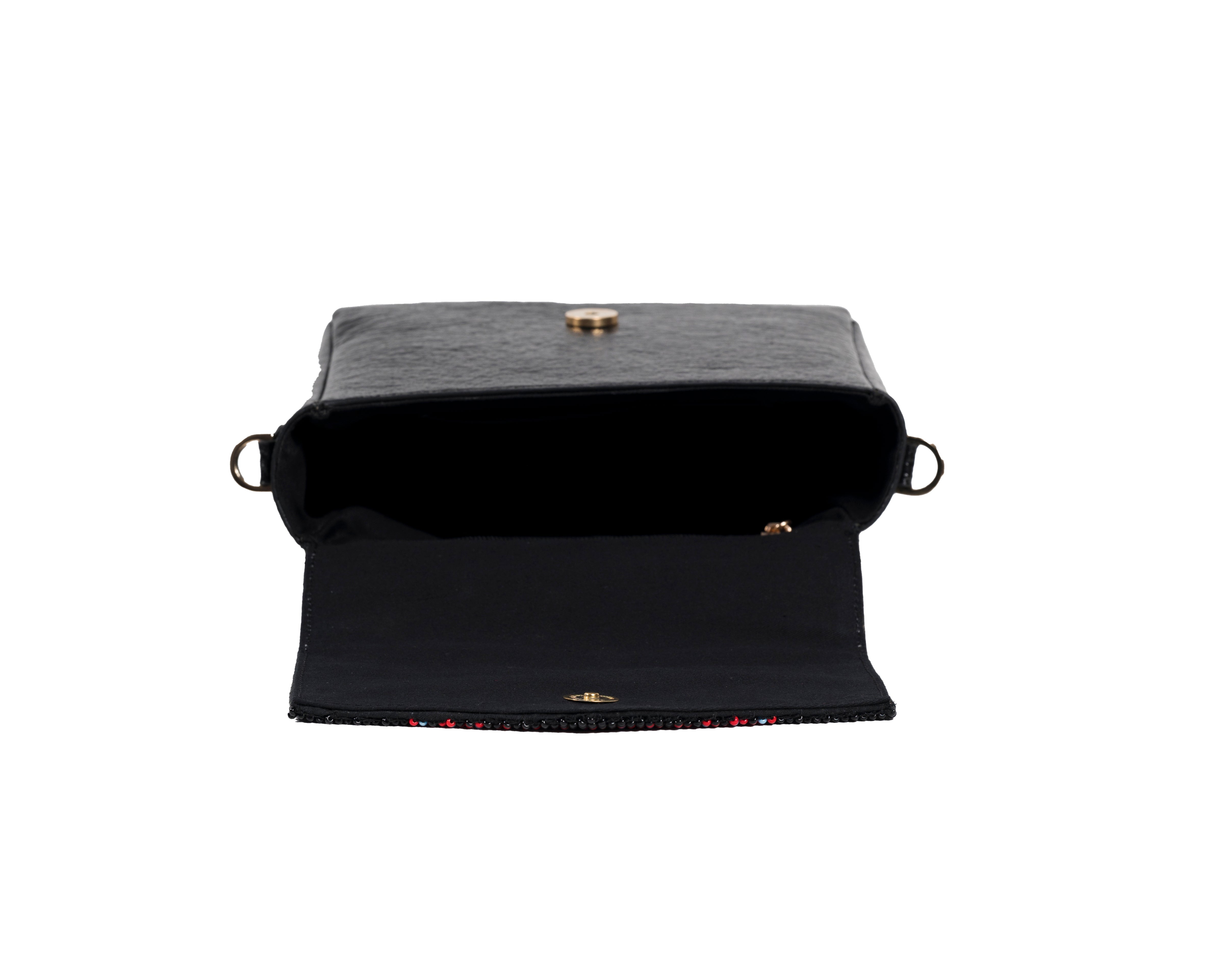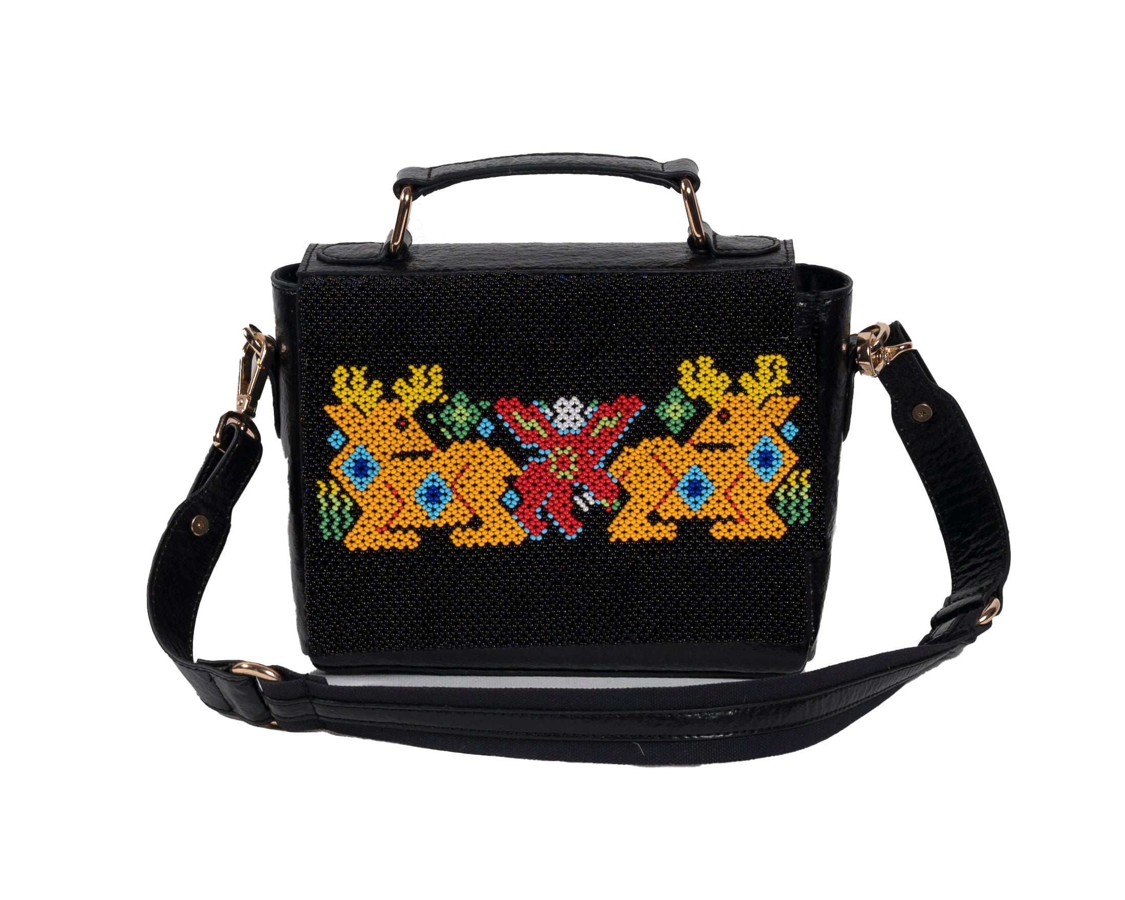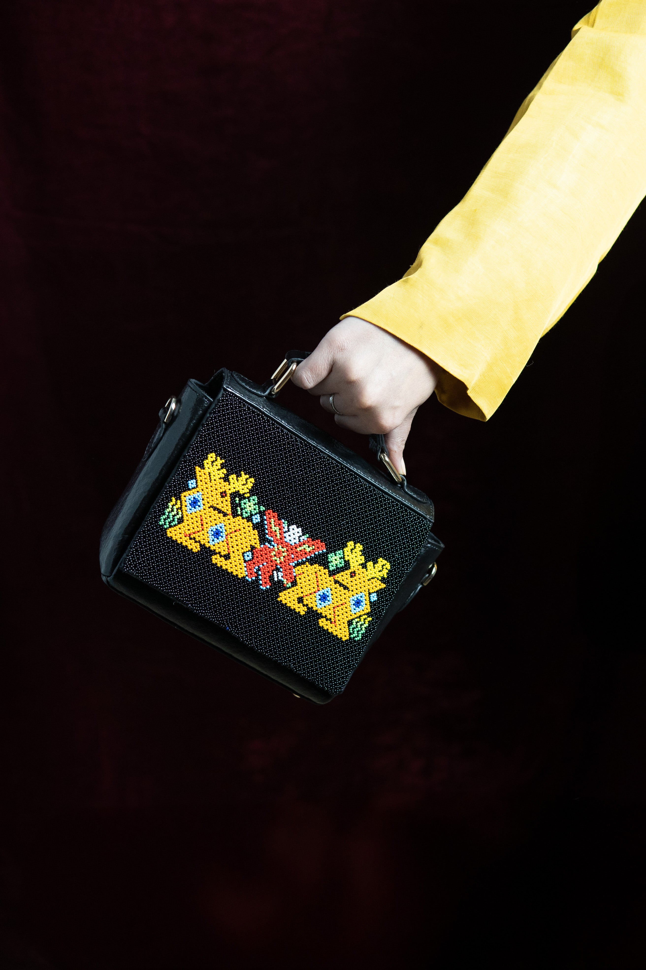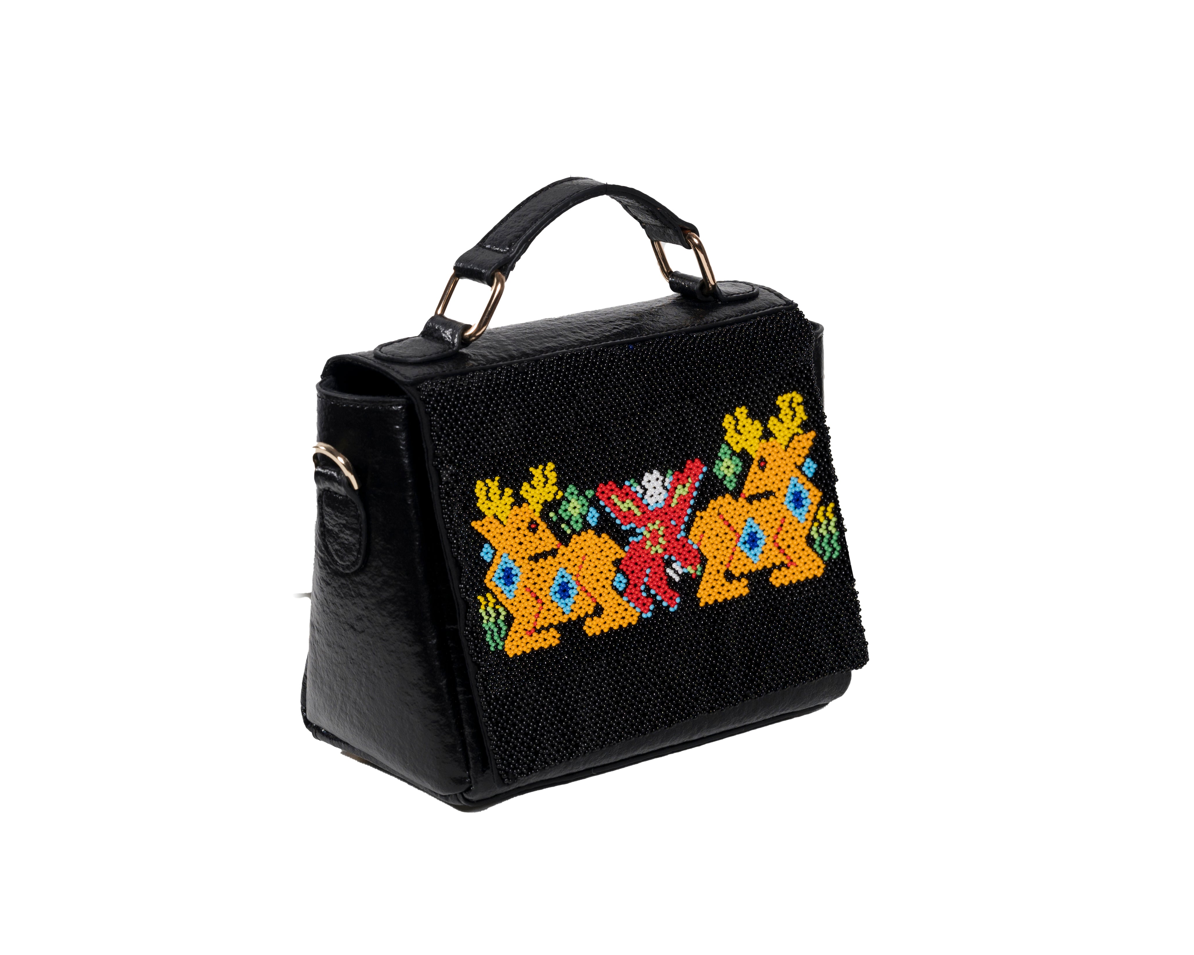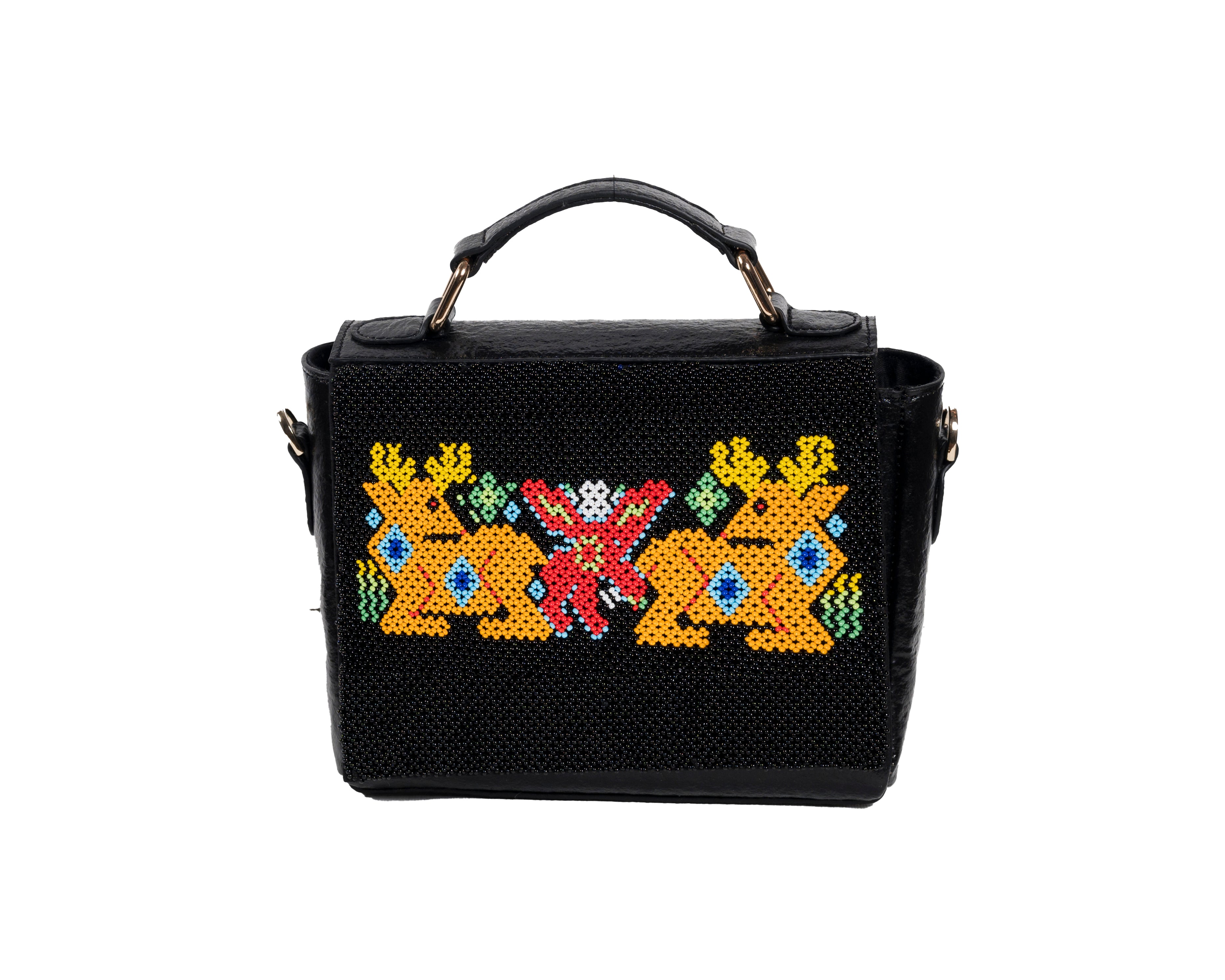 Product details: A playful and bold design featuring two majestic deers in golden yellow, symmetrically positioned around a vibrant central motif in coral and green. This striking composition on a black banana leather base tells a story of Gujarat's rich wildlife heritage through traditional dal-moti beadwork. Each Czech glass bead is meticulously placed by Saurashtra's artisans, creating a narrative piece that makes a powerful style statement. The compact structured design makes it perfect for both special occasions and everyday sophistication.