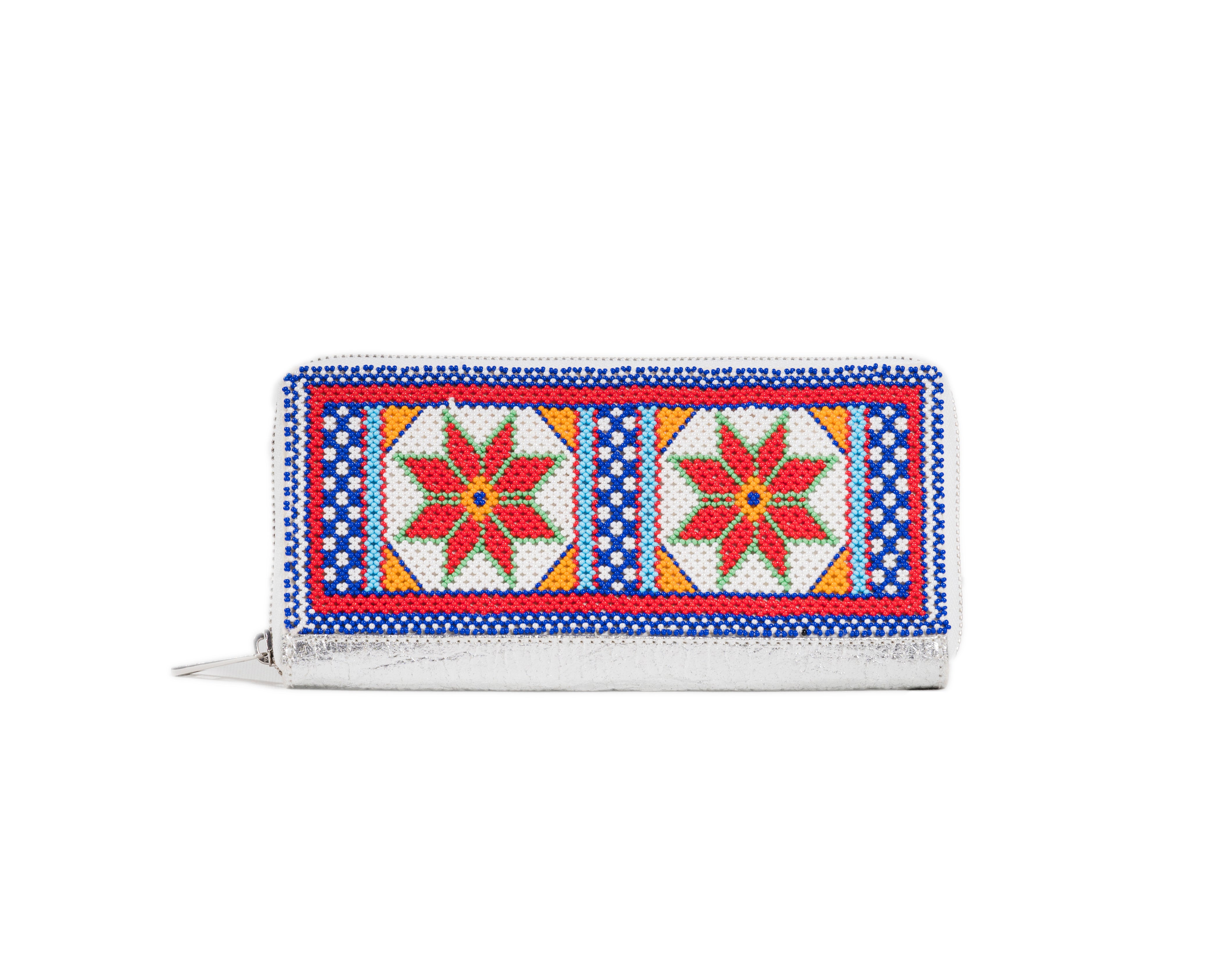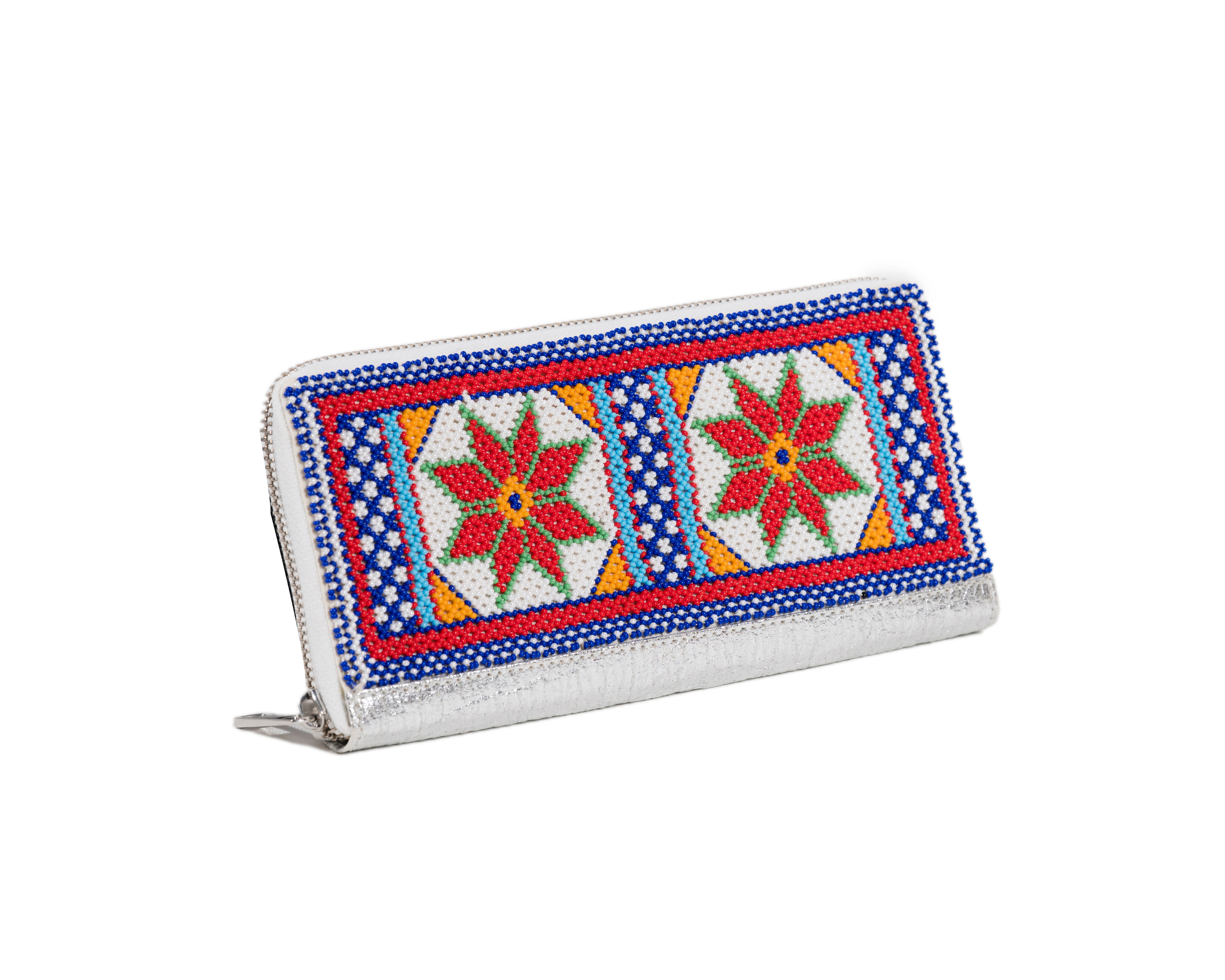 Product details: A stunning fusion of functionality and artistry, this wallet showcases twin star motifs in vivid coral red, set against a pristine silver background. The traditional eight-pointed stars are bordered by geometric patterns in blue, creating a balanced and eye-catching design. Each bead is carefully positioned by skilled artisans, transforming this everyday accessory into a piece of portable art. The sleek silhouette makes it perfect for those who appreciate both utility and cultural craftsmanship.