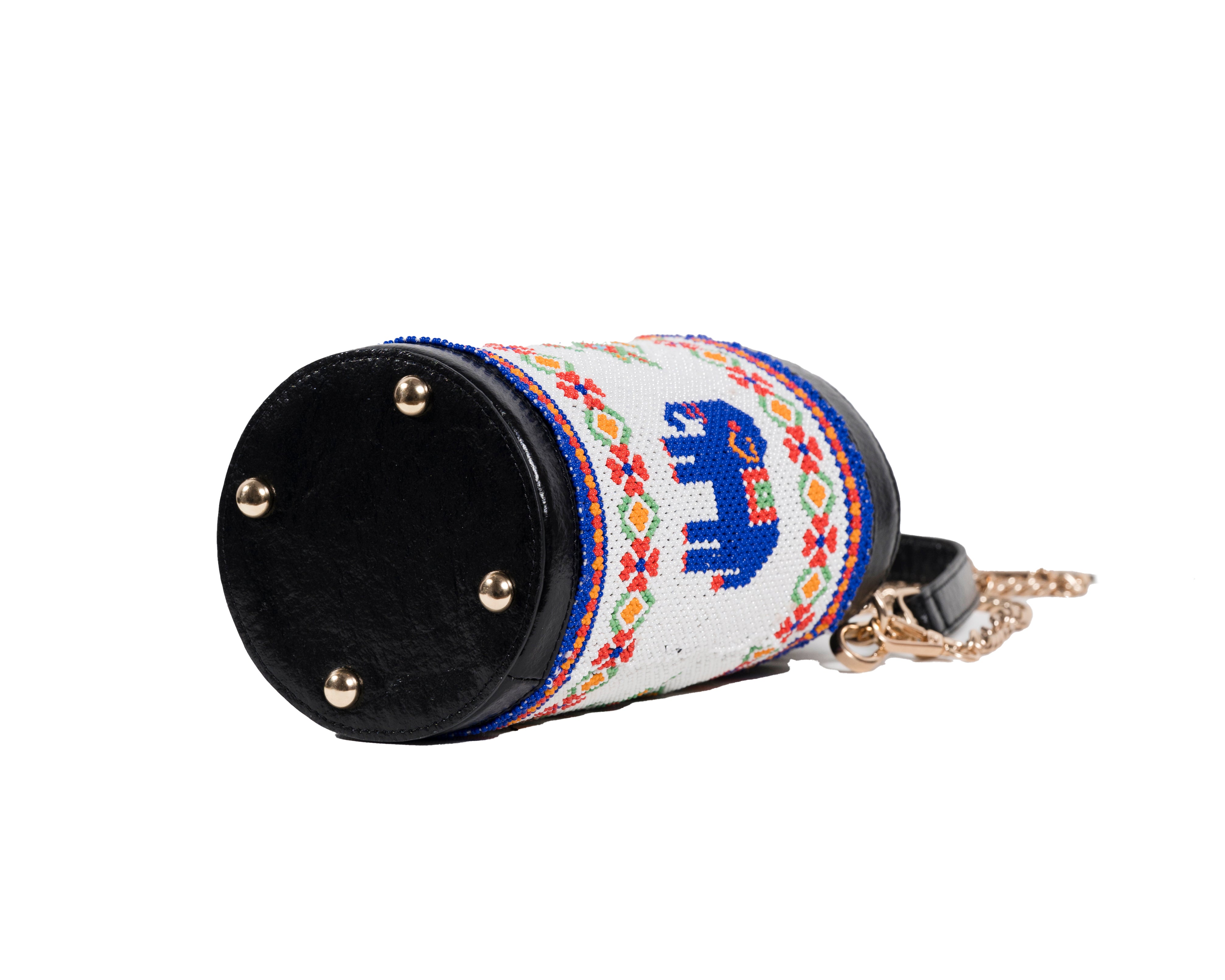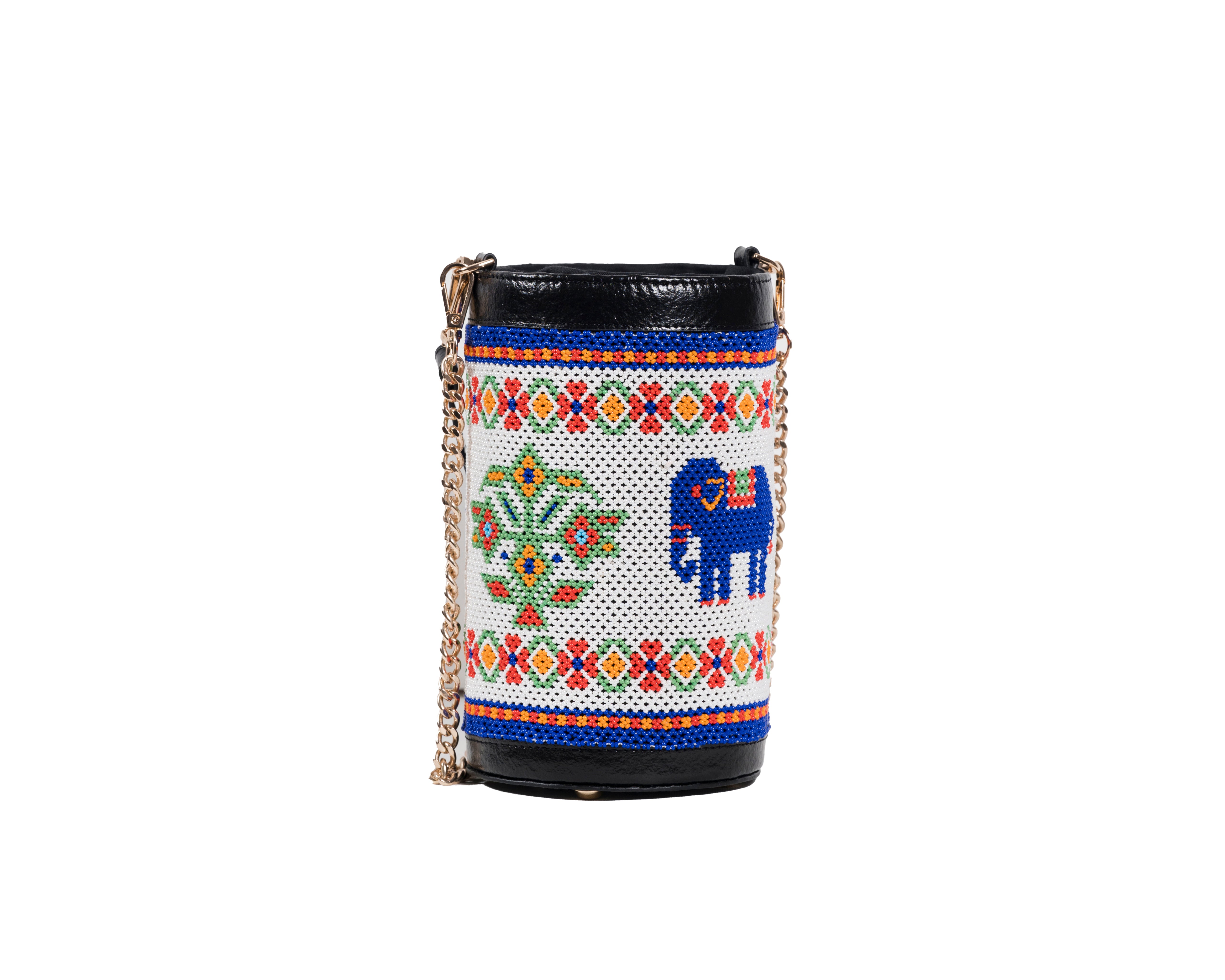 Product details: A delightful cylindrical bag featuring a regal blue elephant amidst traditional floral motifs on a pristine white canvas. The intricate beadwork border showcases a classic geometric pattern in vibrant reds and blues, created using fine Czech glass beads. Each element is carefully handcrafted by artisans from Saurashtra, combining traditional Toran design elements with contemporary functionality. The adjustable banana leather strap and compact cylindrical shape make it perfect for carrying essentials while making a unique style statement. An artisanal conversation starter that celebrates the legacy of Gujarati dal-moti beadwork.