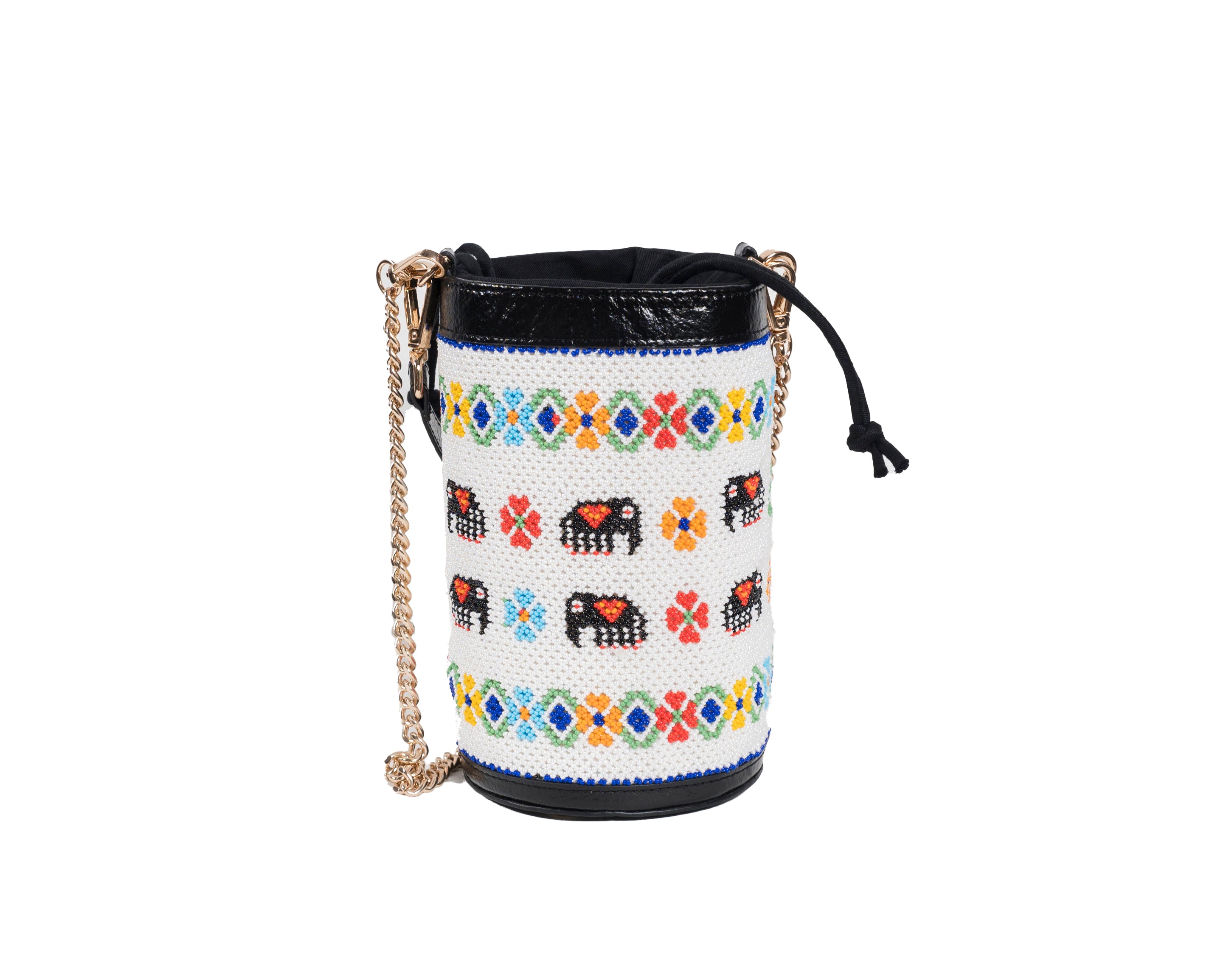 Product details: This enchanting cylindrical bag captures the spirit of festive India with a parade of miniature elephants marching across its circumference. Set against a pure white background, the repeated elephant motif in soft blue creates a rhythmic pattern, bordered by traditional geometric designs in warm colors. Each tiny elephant is meticulously crafted using Czech glass beads by skilled artisans, demonstrating the incredible precision of Gujarati beadwork. The sleek design combines cultural storytelling with modern utility, perfect for those who appreciate artistic accessories with cultural significance.