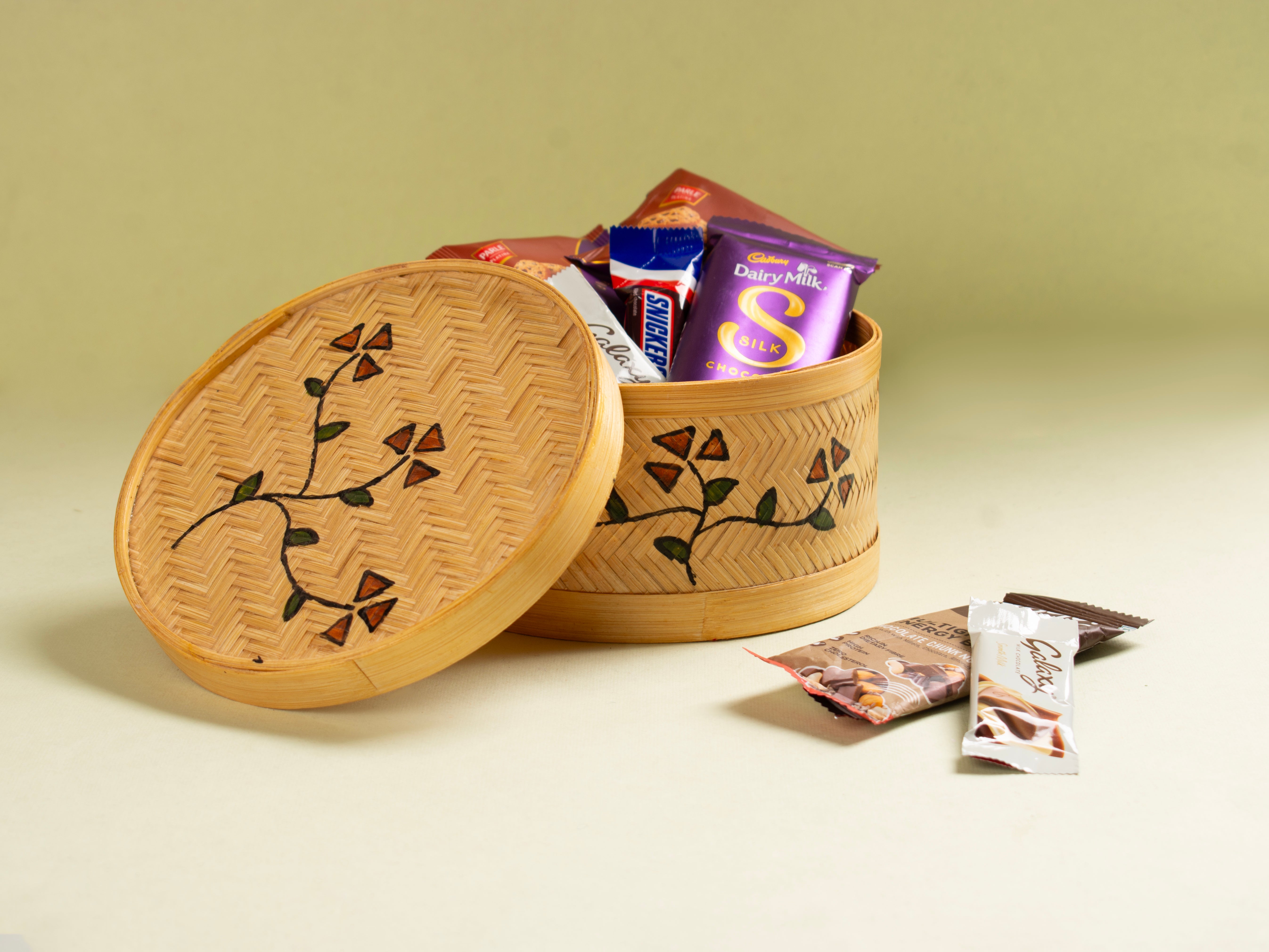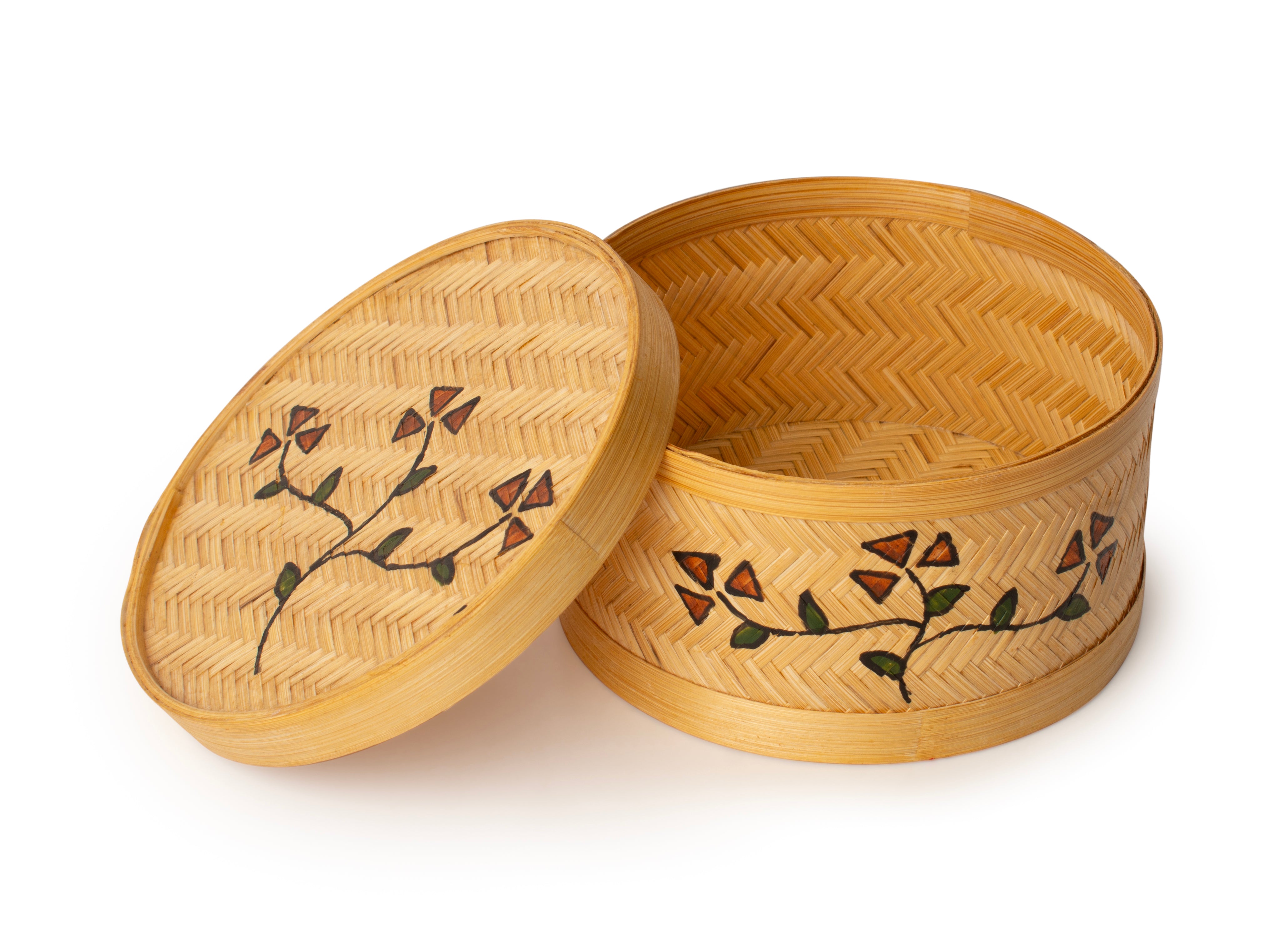 Bring home the charm of sustainable craftsmanship with this hand-painted bamboo round box, featuring a floral vine motif on its lid and sides. Carefully handwoven and painted by artisans, this lightweight yet sturdy box is perfect for gifting, storage, or as a decorative accent. Its natural texture and earthy tones make it a beautiful blend of utility and tradition.