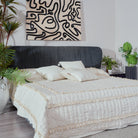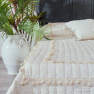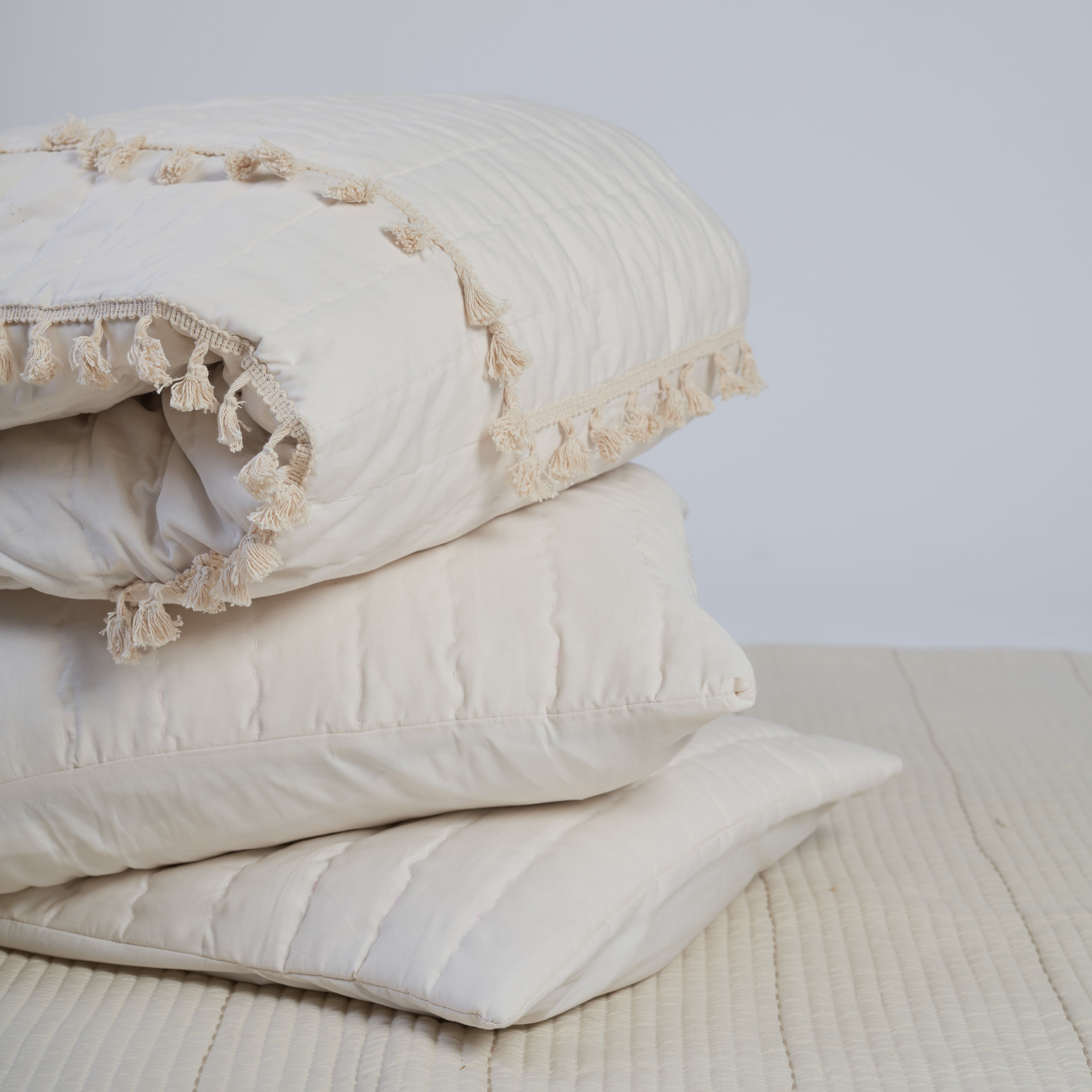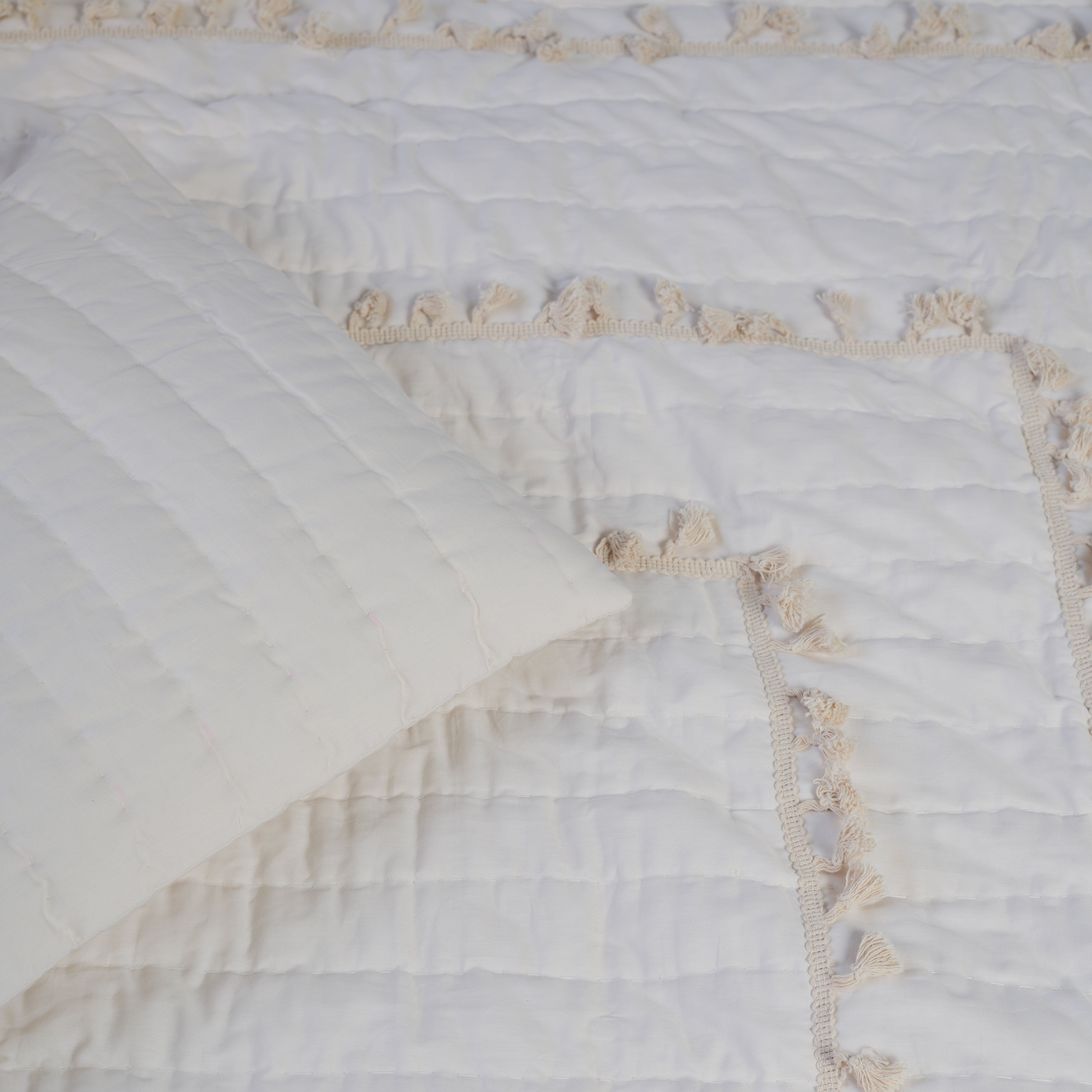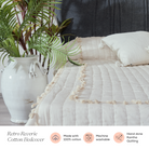 This quilted cotton bedcover, finished with delicate laces and fringes, brings a classic charm to your bedroom. This bedcover effortlessly syncs in with vintage decor, adding a unique and stylish flair. Customizable in both color and size, it ensures a perfect fit for your space. Please note that each order is handcrafted with care and takes 10-12 days to ship. This set includes 1 bedcover and 2 pillow covers