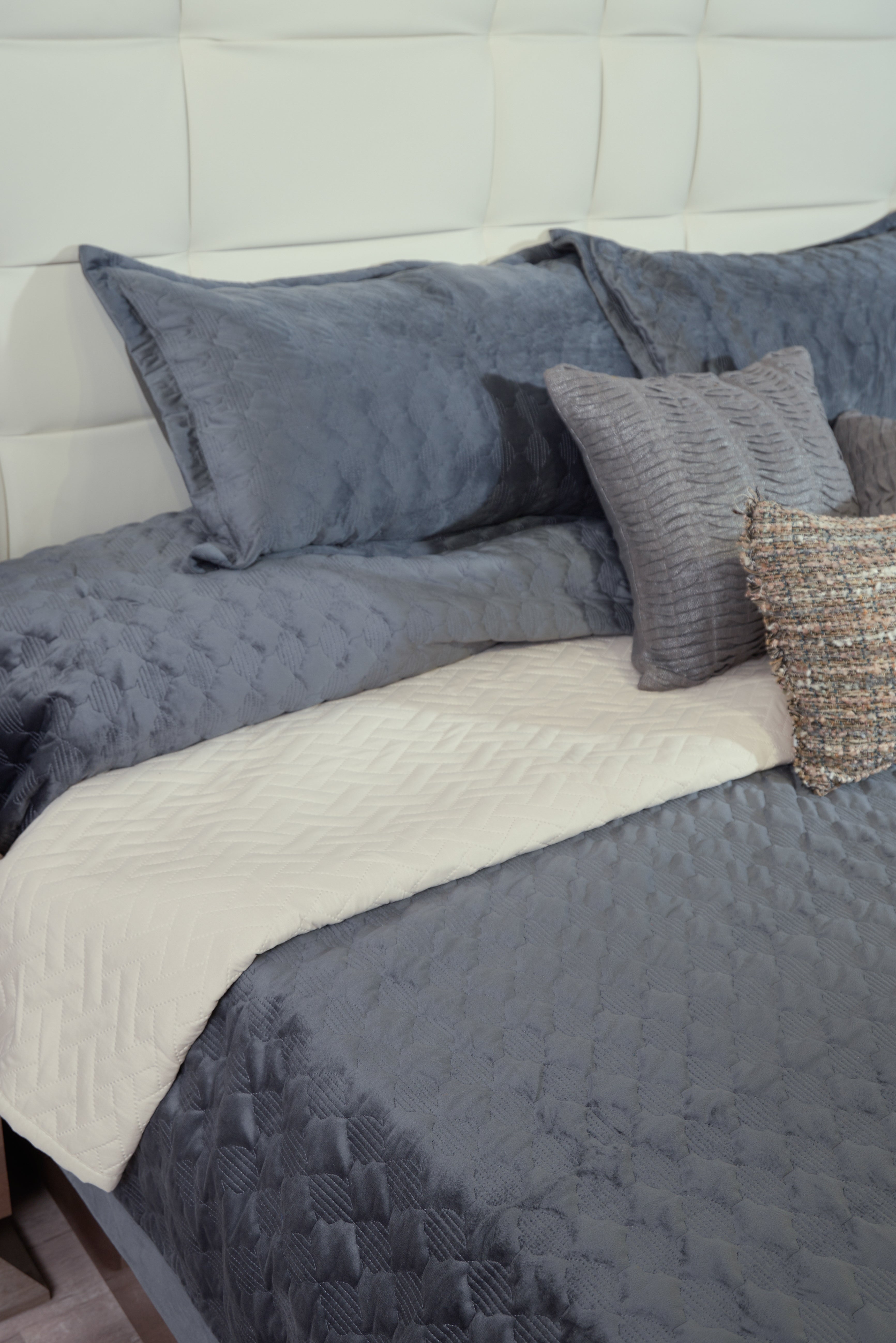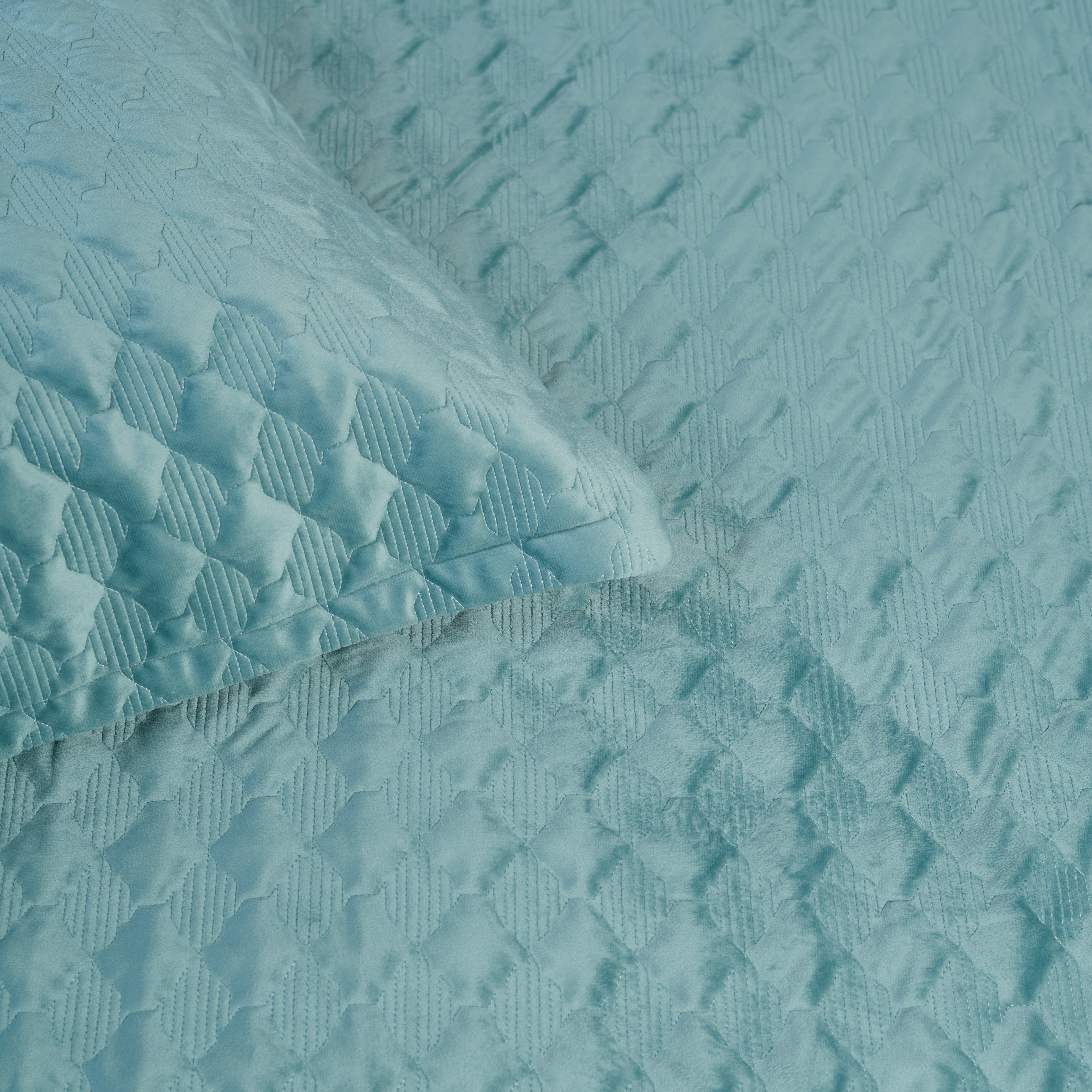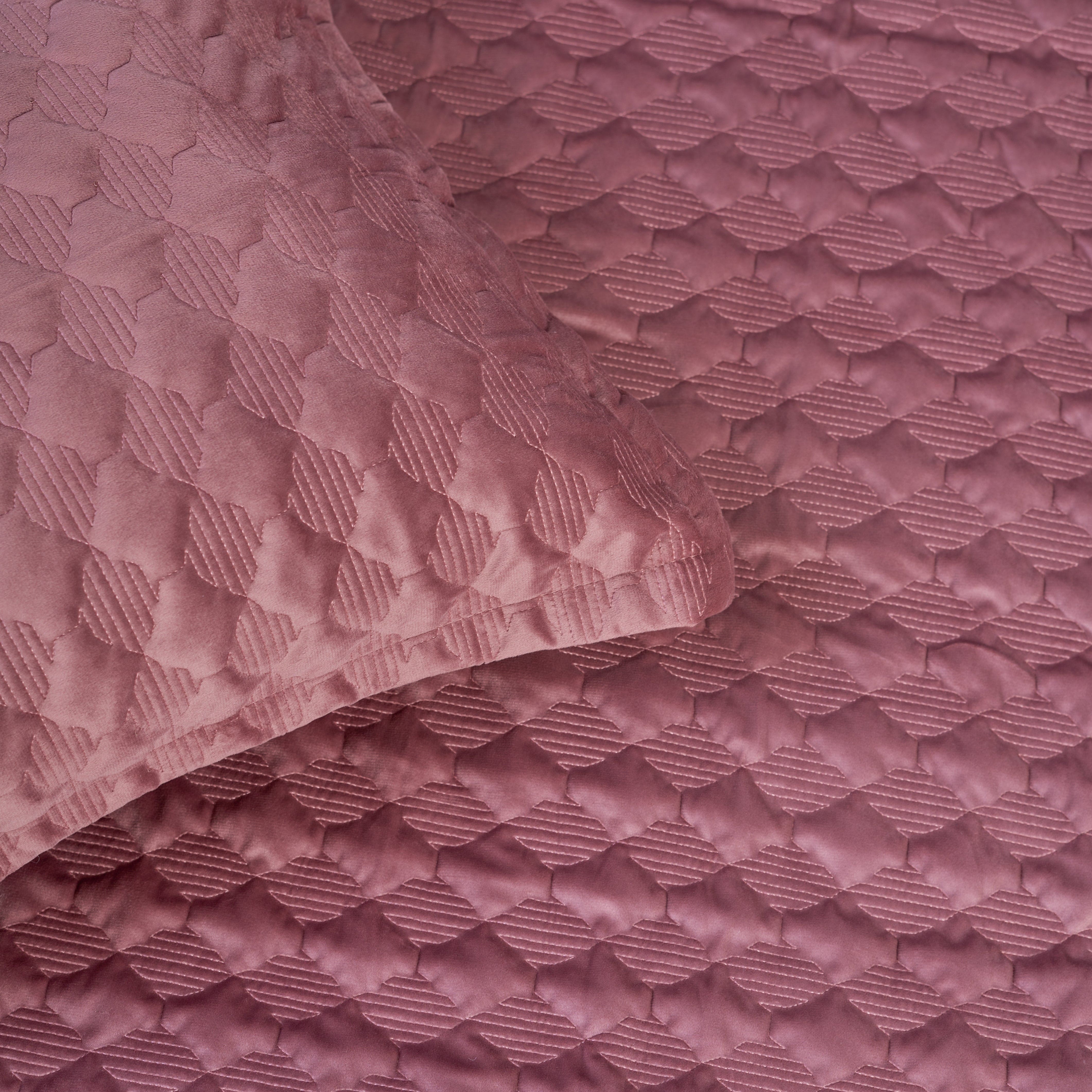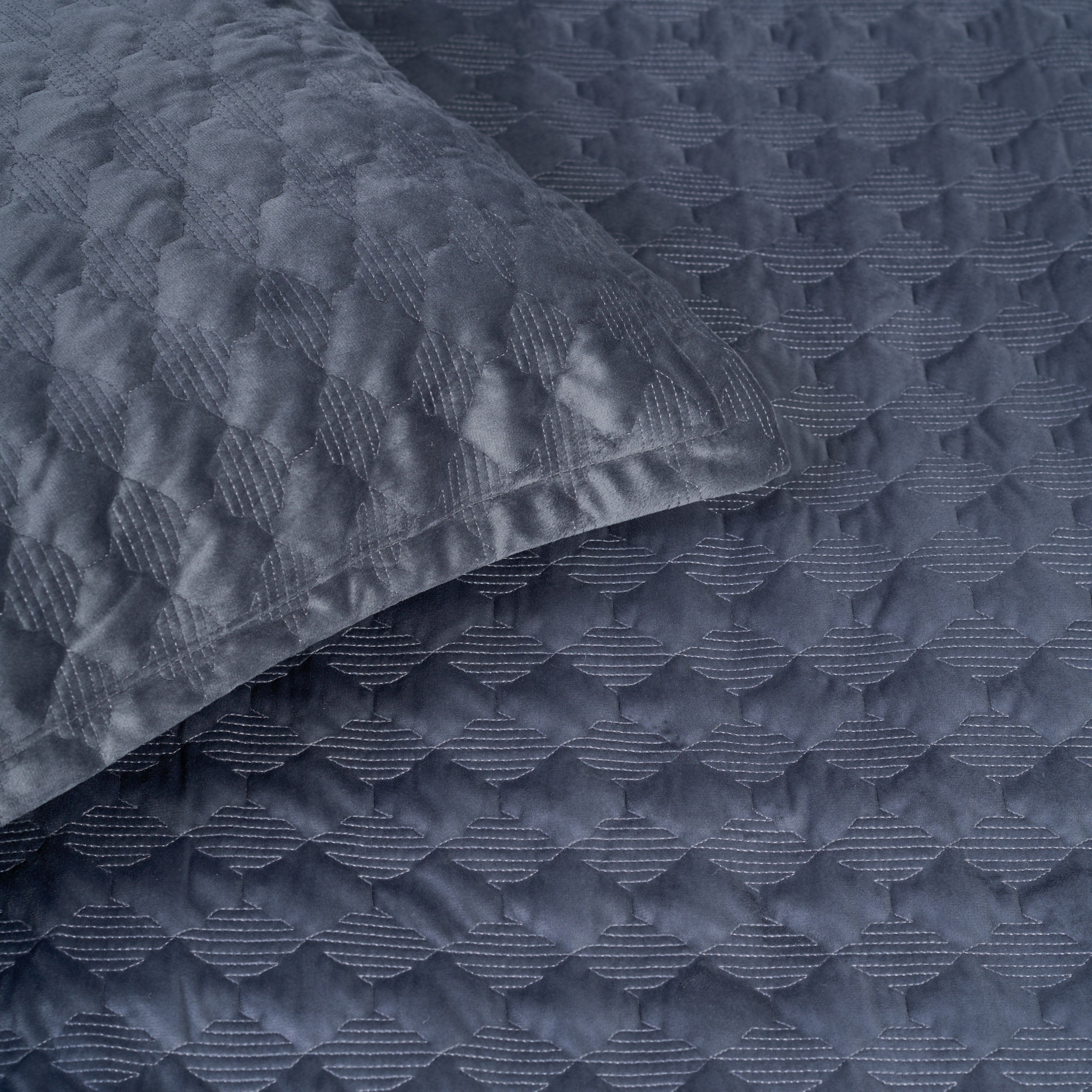 Our luxurious velvet bedcover is crafted to bring a touch of elegance to your bedroom. Quilted with a sophisticated geometric design, this bedcover combines opulence with comfort, offering a rich texture that enhances any setting. Its light velvet material not only gives a plush, comfortable feel but also ensures it's easy to maintain. Elevate your personal space with this one-of-a-kind bedcover. The set includes 1 bedcover and 2 pillow covers.